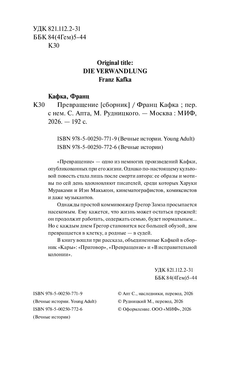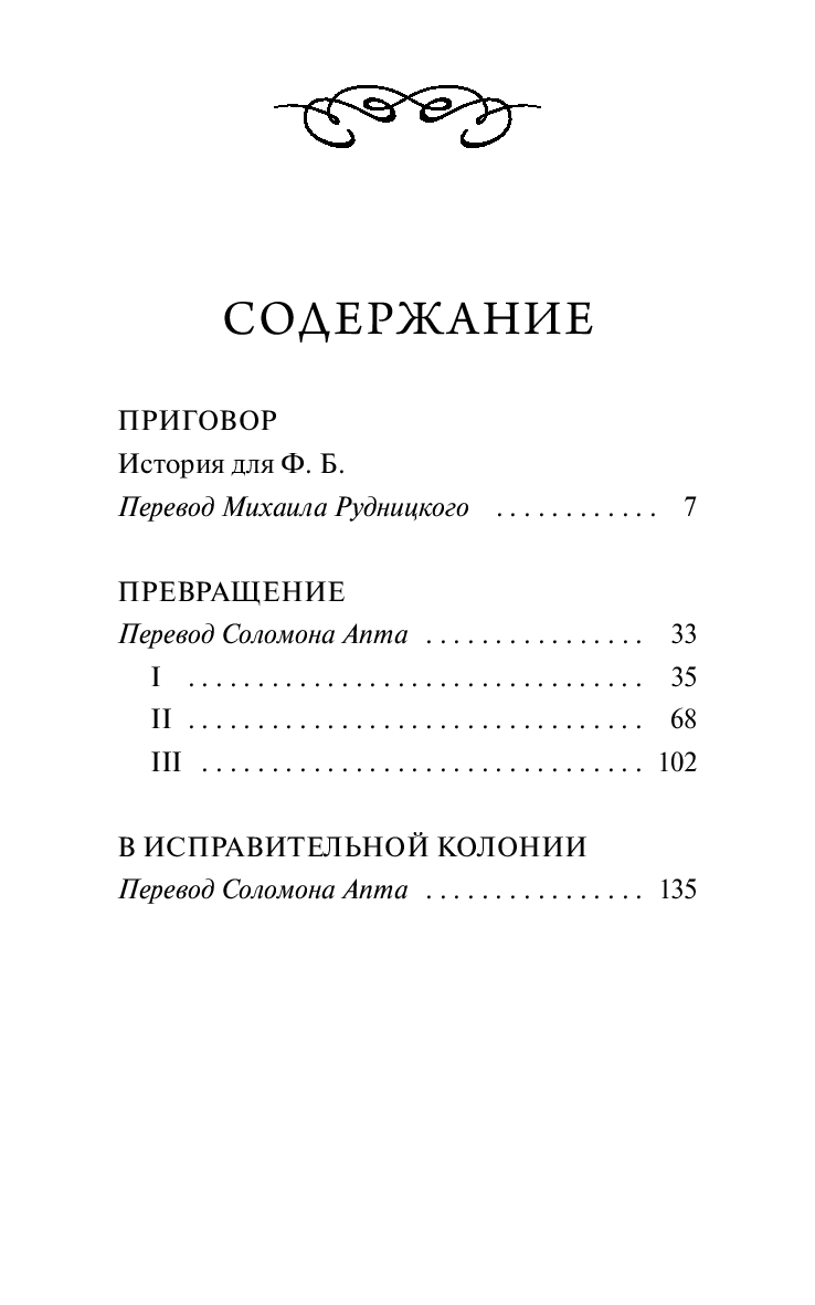 Помимо "Превращения", в книгу вошли еще два текста из трилогии "Кары": "Приговор" и "В исправительной колонии".