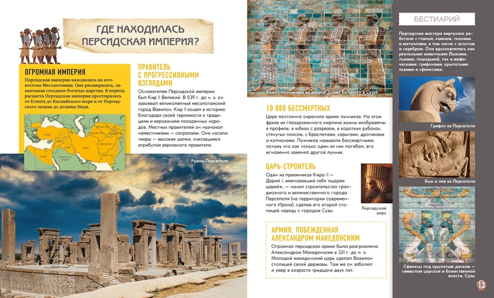 Вы узнаете про Ворота Иштар в Вавилоне, дворец в Дур-Шаррукине, храмы Абу-Симбела, прочитаете об индийских сказаниях, пирамидах Гизы и масках народов Африки.