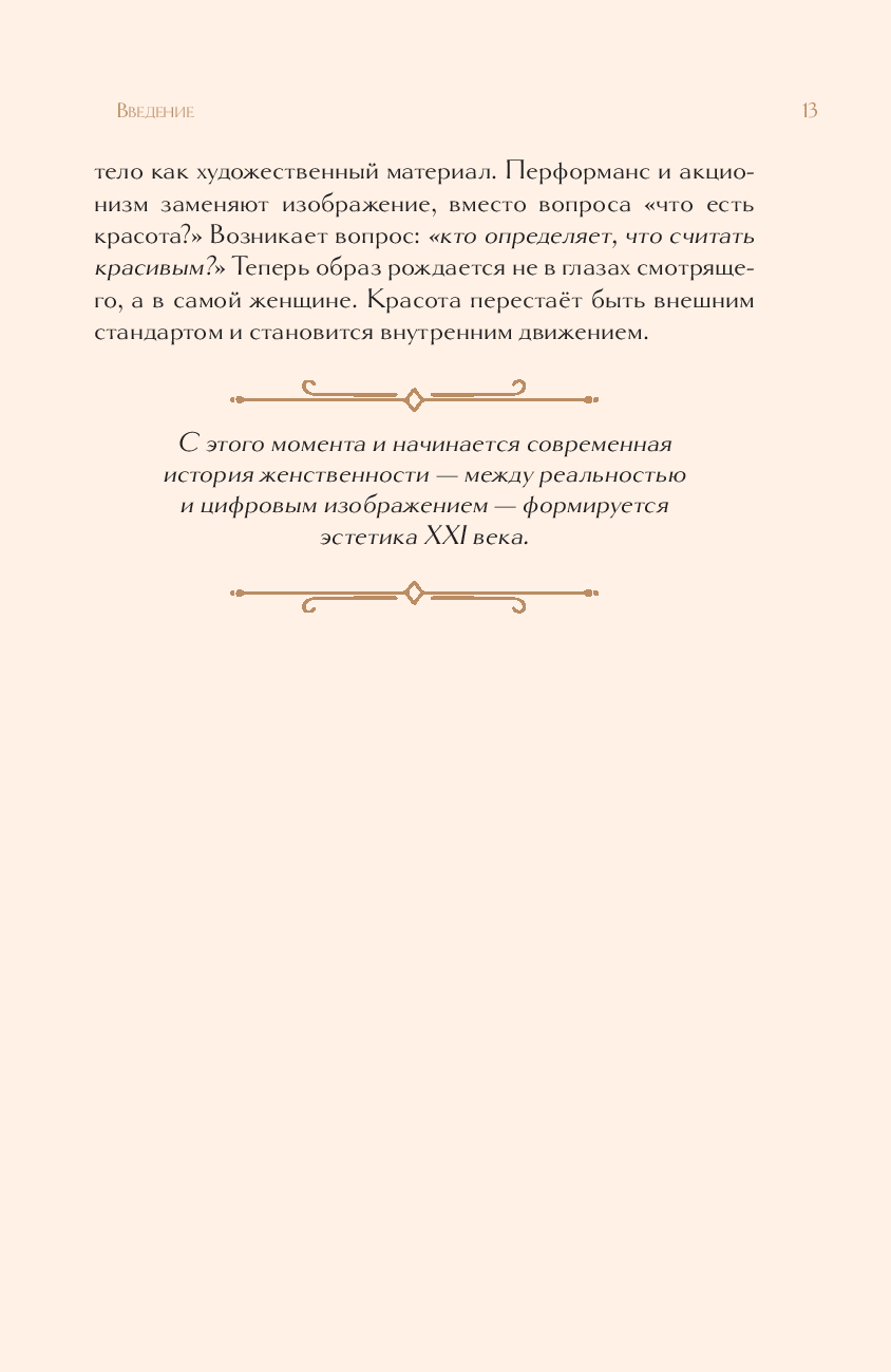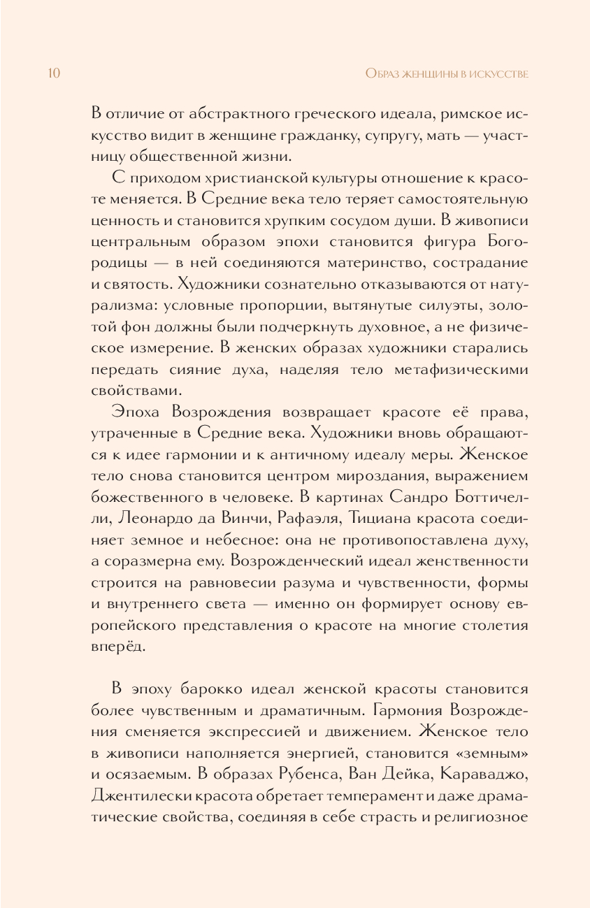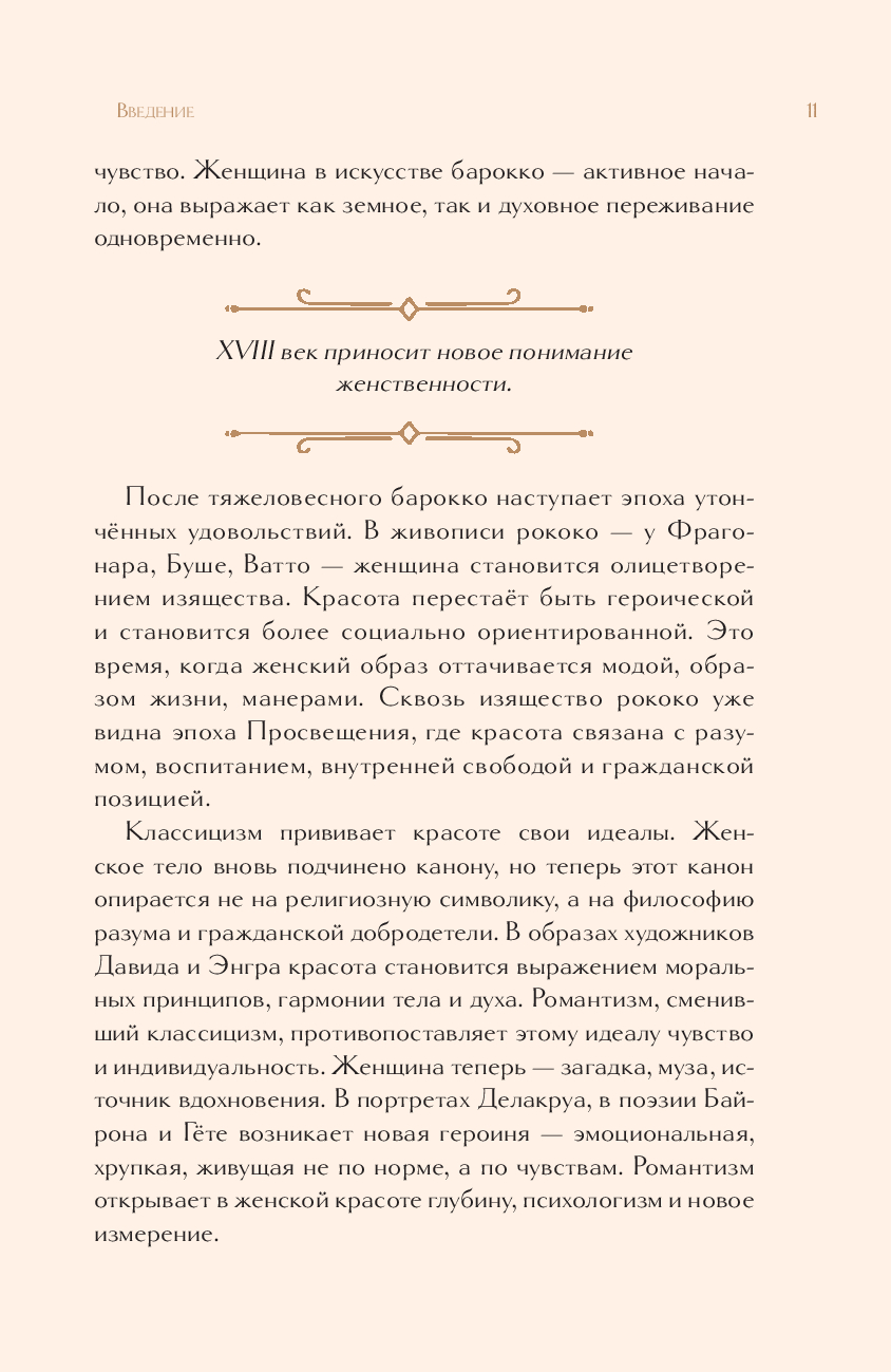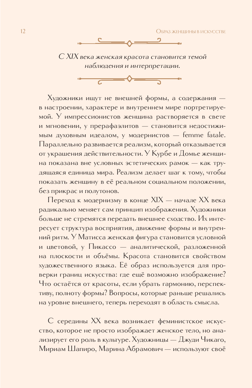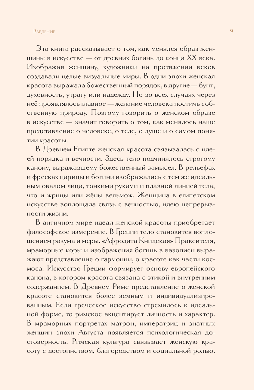 Перед вами исследование, превращённое в эстетическое путешествие по истории искусства. Искусствовед Дарья Оскин прослеживает, как на протяжении веков менялись представления о женской красоте, силе и роли в обществе – от строгих канонов древних цивилизаций до утончённой индивидуальности XX века. На страницах книги оживают великие образы – Нефертити и Венера, Джоконда и ренуаровские купальщицы, звёзды золотого века кино и мировые модели. Через них раскрывается, как в разные эпохи художники пытались уловить суть женственности – от идеала до личности, от символа до живого характера.