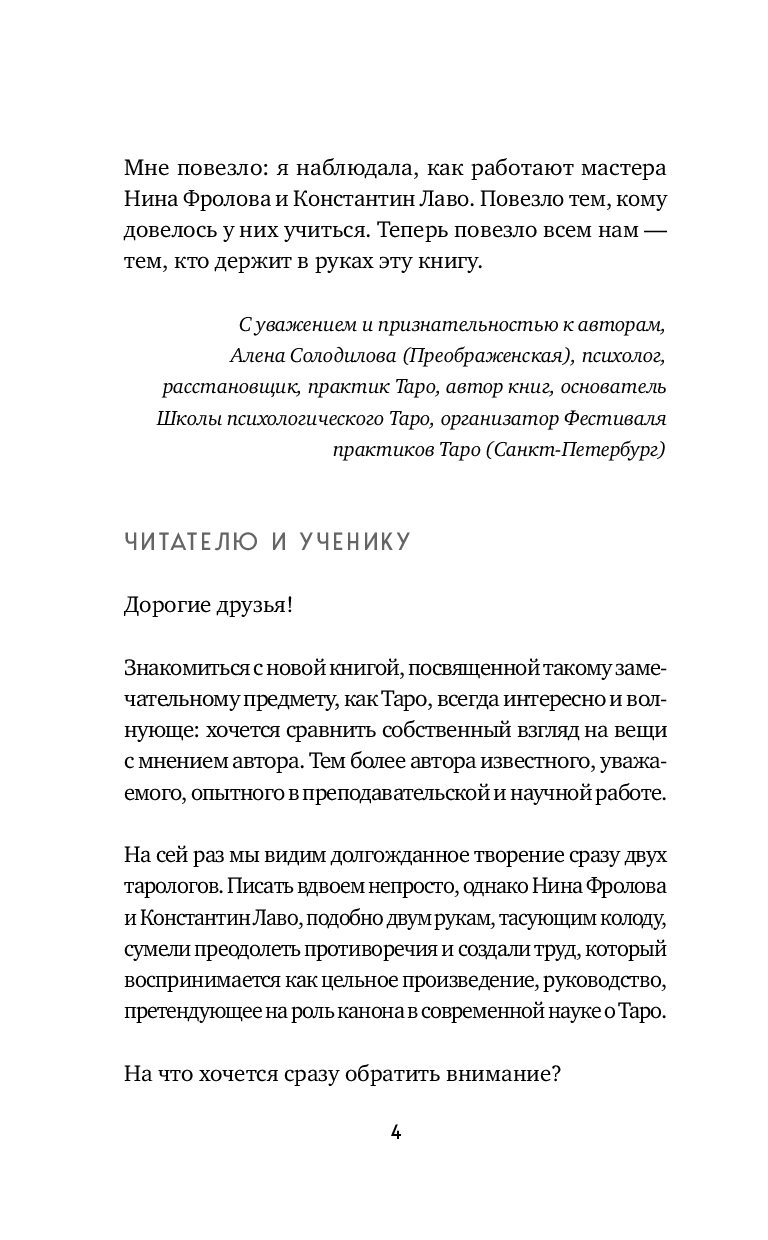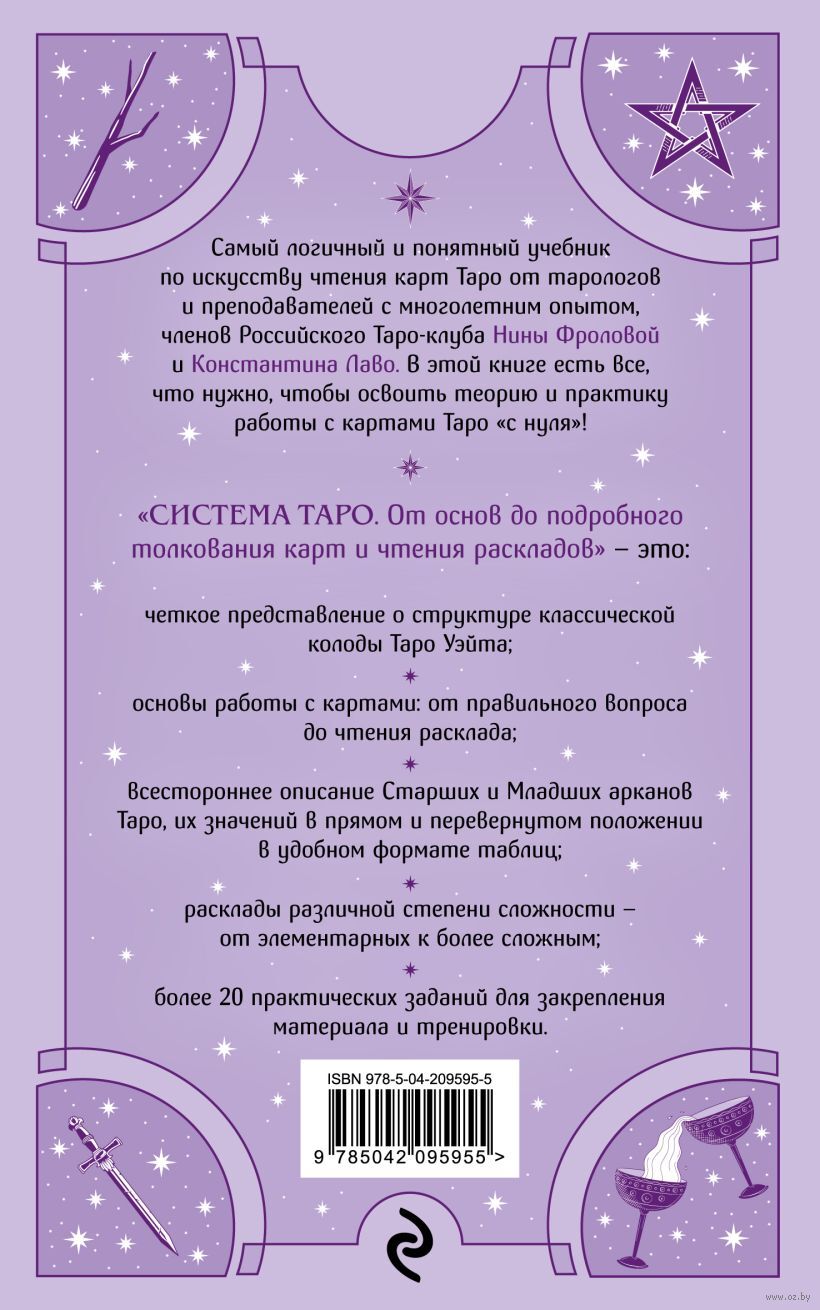 В книге "Система Таро. От основ до подробного толкования карт и чтения раскладов" тарологов и преподавателей с многолетним опытом, членов Российского Таро-клуба Нины Фроловой и Константина Лаво есть все, что нужно, чтобы освоить теорию и практику работы с картами Таро и искусство предсказания. Здесь вы найдете подробное описание структуры Таро, тематические значения (любовь, деньги, работа, советы и предостережения) для всех Старших и Младших арканов на в удобном формате таблиц, расклады различной степени сложности, правила их чтения и трактовки, общие принципы гадания и взаимодействия с картами. Книга иллюстрирована картами из Таро Уэйта, самой знаменитой колоды Таро в мире!
