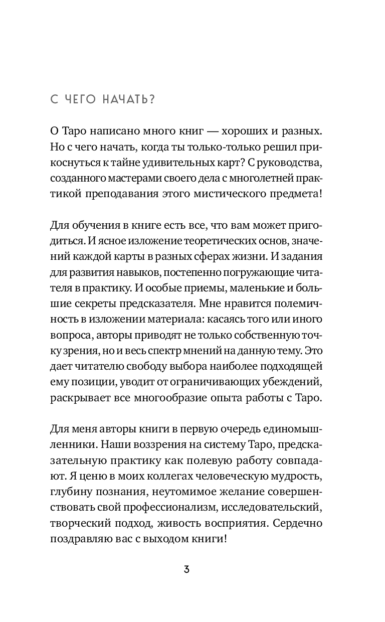 Подробное и систематизированное изложение материала, обилие примеров из практики авторов, а также многочисленные практические задания делают эту книгу универсальным руководством как для начинающих тарологов, так и для опытных практиков, совершенствующих свое мастерство.