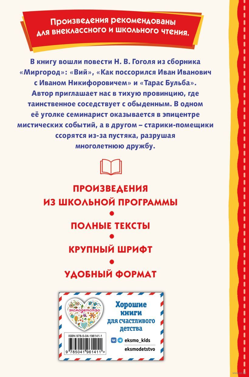В книгу вошли повести Н. В. Гоголя из сборника "Миргород": "Вий", "Как поссорился Иван Иванович с Иваном Никифоровичем" и "Тарас Бульба". В своих произведениях писатель мастерски сочетает юмор, яркие народные характеры и исторические мотивы, показывая, как в смешном и пугающем отражается подлинная человеческая жизнь.