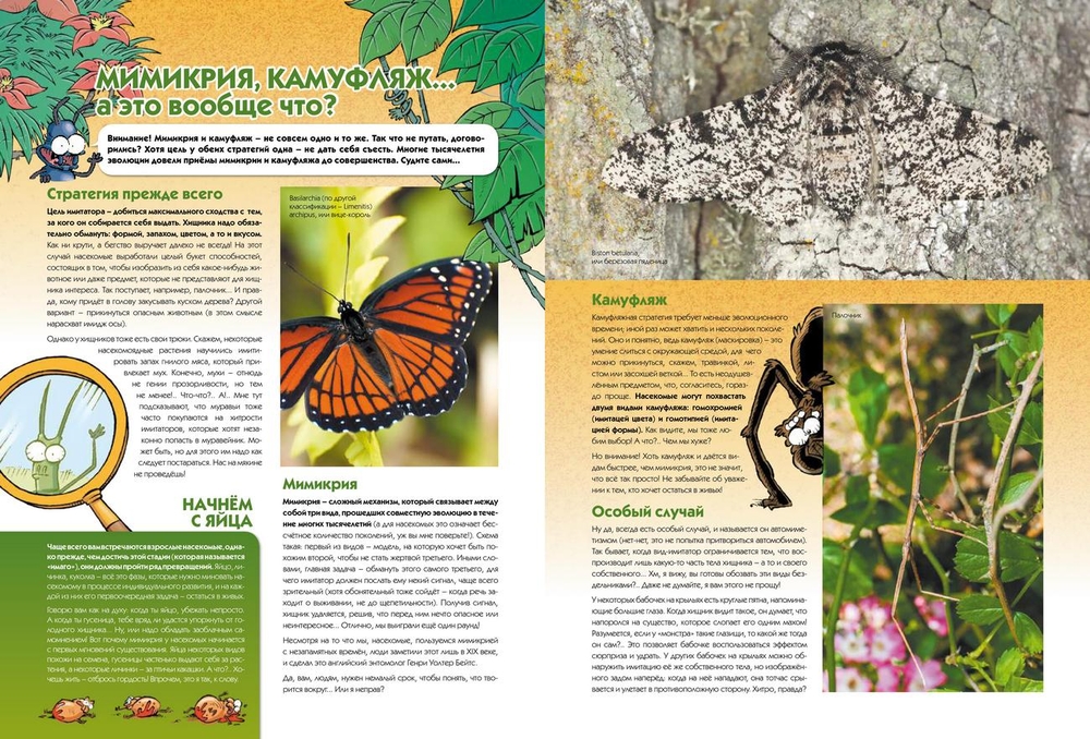 Но и это ещё не всё! Завершает книгу подробная лекция на такую, прямо скажем, животрепещущую для насекомых тему, как мимикрия и камуфляж. Важно отметить, что авторы не стали городить отсебятину, и в качестве основного спикера пригласили специалиста – муравья, который подошёл к делу со всей ответственностью и даже позвал на подмогу своих друзей, настоящих профессионалов: голубянку, берёзовую пяденицу, грязного хищнеца, листовидку и многих, многих других. Уж кто-кто, а они своё дело знают!