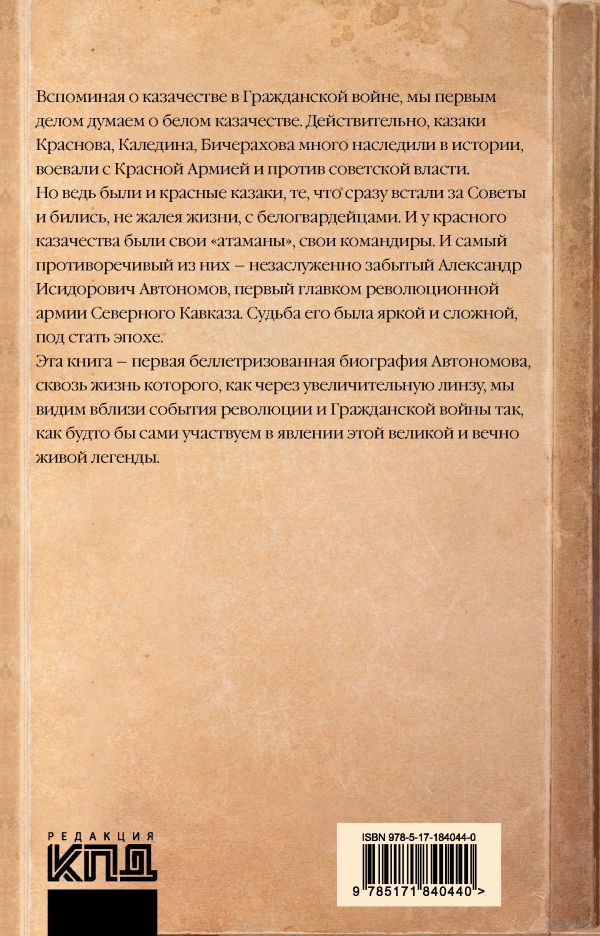 Вспоминая о казачестве в Гражданской войне, мы первым делом думаем о белом казачестве. Действительно, казаки Краснова, Каледина, Бичерахова много наследили в истории, воевали с Красной Армией и против советской власти. Но ведь были и красные казаки, те, кто сразу встали за Советы и бились, не жалея жизни, с белогвардейцами. И у красного казачества были свои "атаманы", свои командиры. Таким был Александр Исидорович Автономов, первый главком революционной армии Северного Кавказа. Судьба его была яркой и сложной, под стать эпохе. Прекрасный историк и писатель, Сергей Павлович Петров, написал эту книгу – первую беллетризованную биографию Автономова, сквозь жизнь которого, как через увеличительную линзу, мы видим вблизи события революции и Гражданской войны так, как будто бы сами участвуем в явлении этой великой и вечно живой легенды.