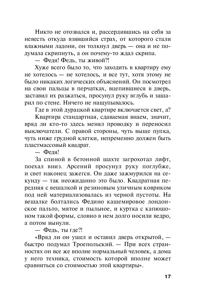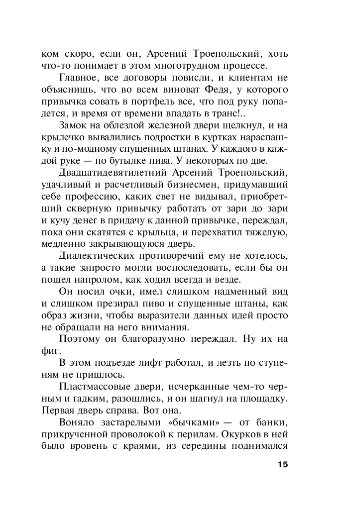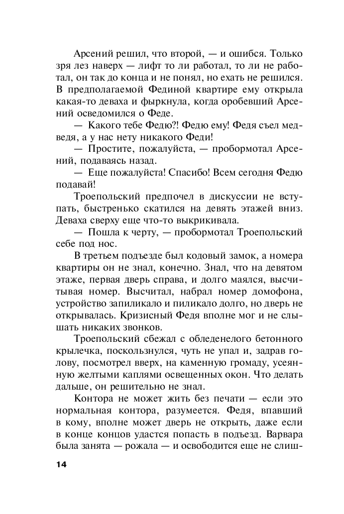 Арсений Троепольский признавал в жизни только одно – работу. Она была его религией, его возлюбленной, его развлечением. Дизайнерская компьютерная фирма, которую он возглавлял, – процветала. И вот внезапно гром грянул среди ясного неба. Убили зама Троепольского, гения дизайна – Федора Грекова. Самое ужасное, что его труп нашел... Арсений. Отсидев три дня в кутузке как главный подозреваемый, он, наконец, появился в конторе, но возвращение к любимой работе не принесло радости. Пытаясь понять, кто и почему убил Федю, он обнаружил, что все вокруг лгут – сотрудники, любовница, сестра и племянница покойного. Но его мозг, работающий как компьютер, все разложил по полочкам. И гора лжи рухнула и погребла под собой всех "достойных"...