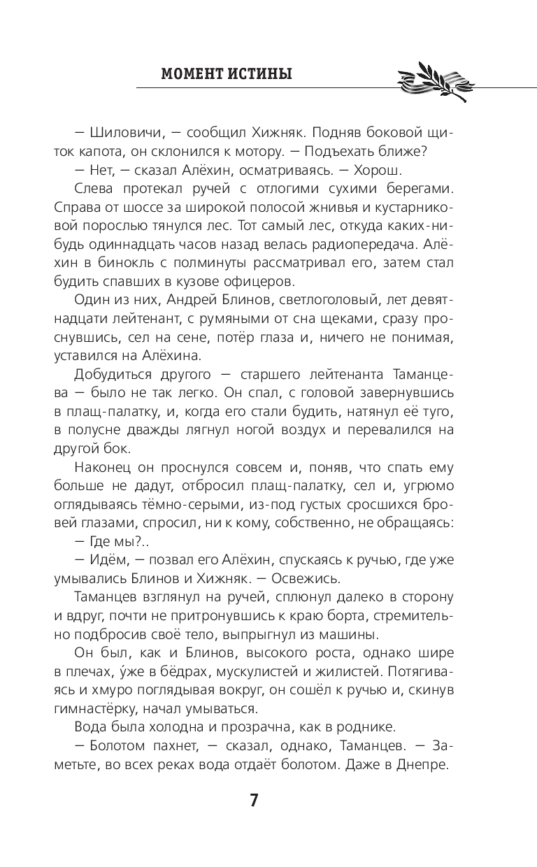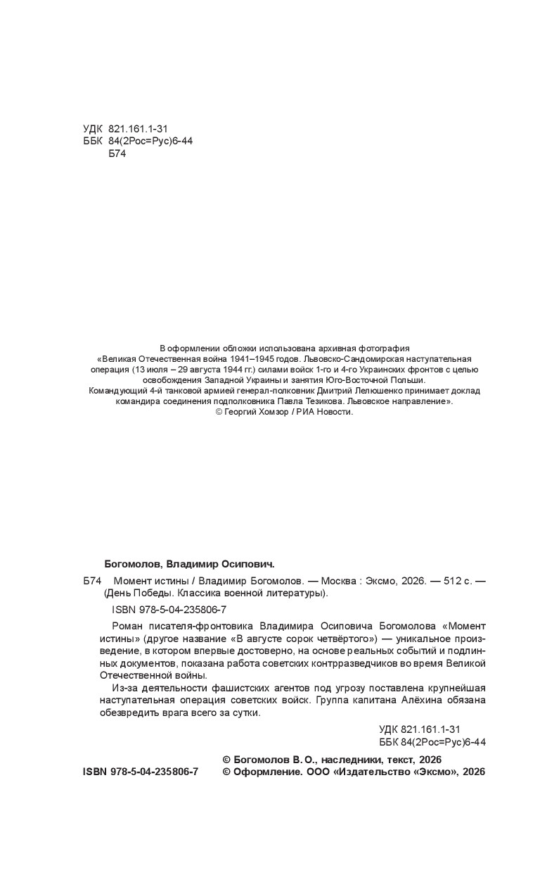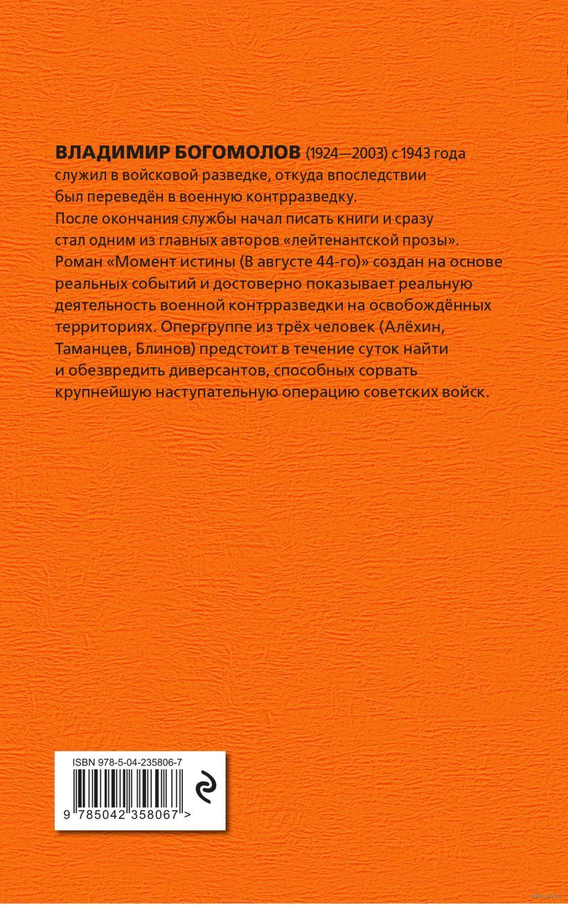Роман писателя-фронтовика Владимира Осиповича Богомолова "Момент истины" (другое название "В августе сорок четвёртого") – уникальное произведение, в котором впервые достоверно, на основе реальных событий и подлинных документов, показана работа советских контрразведчиков во время Великой Отечественной войны.