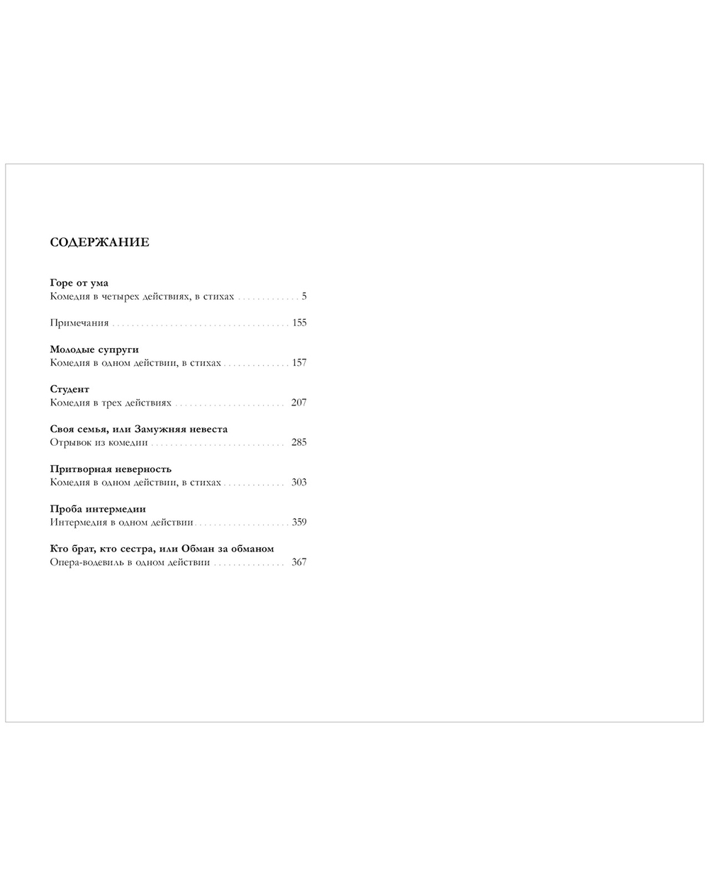 В сборник также вошли другие произведения Грибоедова: "Молодые супруги", "Студент", "Своя семья, или Замужняя невеста", "Притворная неверность", "Проба интермедии", "Кто брат, кто сестра, или Обман за обманом".