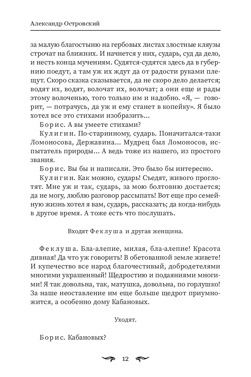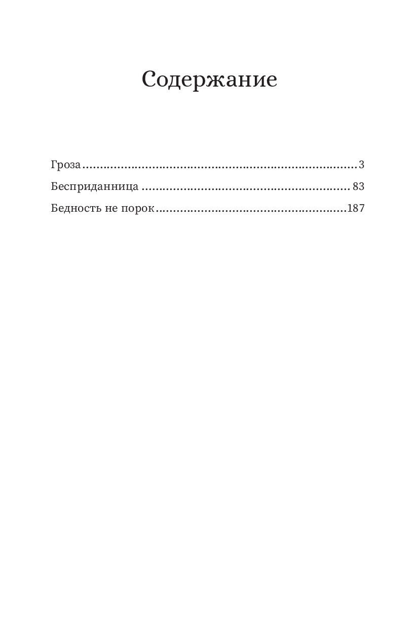 В сборник вошли три пьесы Александра Островского: "Гроза", "Бесприданница", "Бедность не порок". Это истории, в которых за старинными декорациями – очень узнаваемые чувства: страх быть не таким, боль от несвободы, жажда любви и попытка остаться собой.