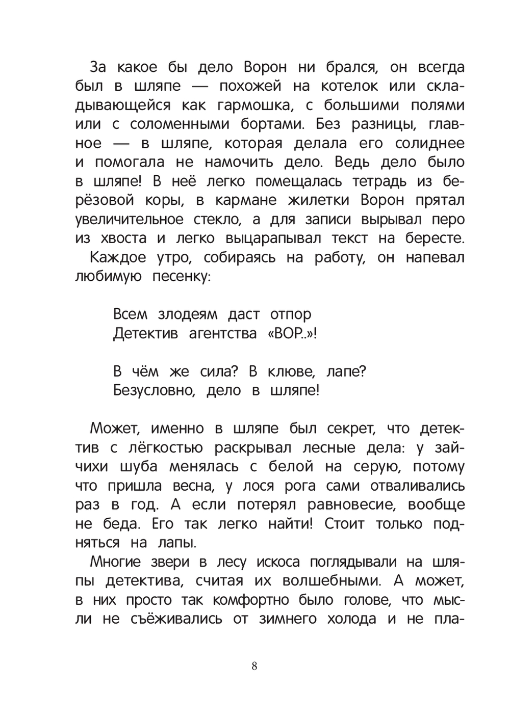 Лес Верхушки-до-небес полон загадок: звери просыпаются в чужих шубах после новогоднего карнавала, дупловой исчезает из беличьего дупла, кем-то испорчен Календарь отлёта птиц! Во всём разберётся детективное агентство "ВОР..". Агентство такое старое, что на входной табличке отвалилась пара букв. Единственный сотрудник, детектив Ворон из академии "Шерлок Карс", работает без отпусков и выходных. Перо из хвоста и "Кар!" у детектива Ворона всегда с собой. А ещё – дело в шляпе, чтобы не намокло. Детектив Ворон с лёгкостью распутывал дела, пока однажды не прошляпил собственное чёрное оперение.