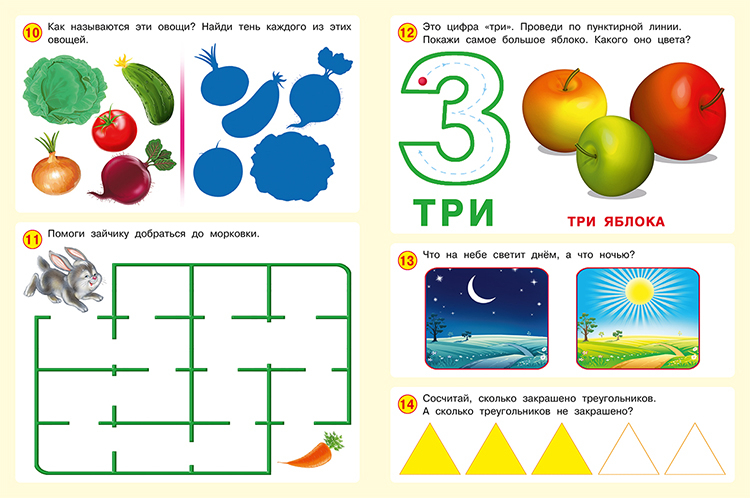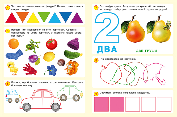 В сборнике много заданий на раскрашивание, поиск недостающих картинок и отличий. А также прописи, азбука, буквы, геометрические фигуры и формы, блоки с изучением цифр, цветов, времен года, животных, ребусы, ребенок научится считать до 10 и многое другое. Все задания распределены от простого к сложному. Бумага в альбоме качественная, белая, можно писать ручкой и карандашом, стирать ластиком.