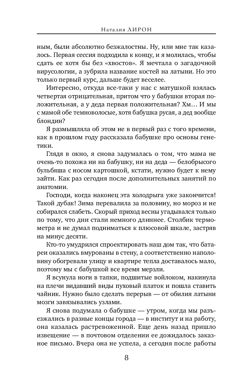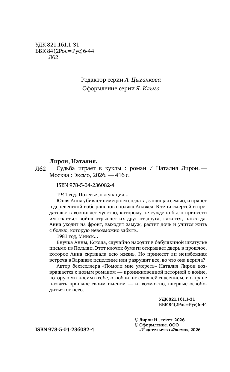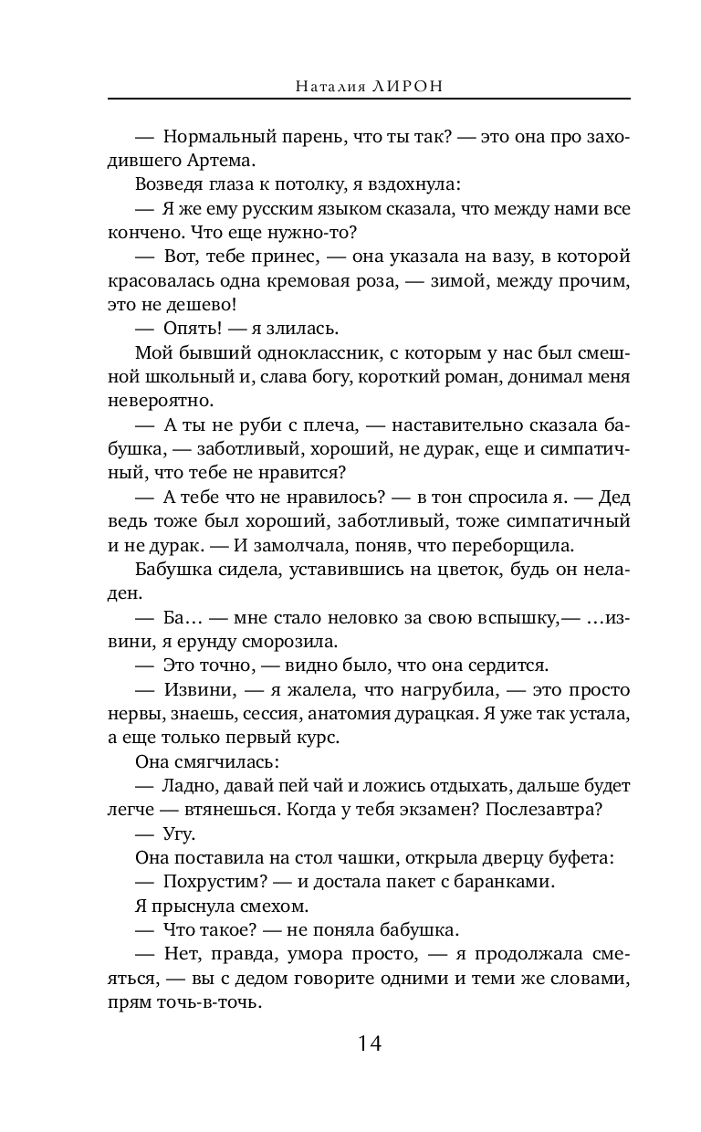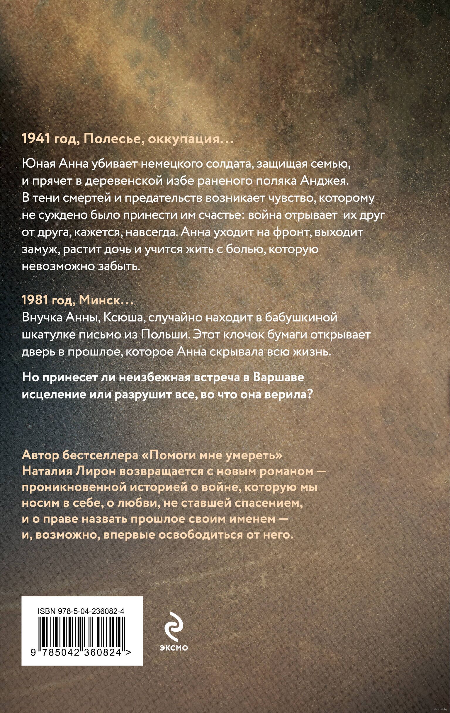 Автор бестселлера "Помоги мне умереть" Наталия Лирон возвращается с новым романом – проникновенной историей о войне, которую мы носим в себе, о любви, не ставшей спасением, и о праве назвать прошлое своим именем – и, возможно, впервые освободиться от него.