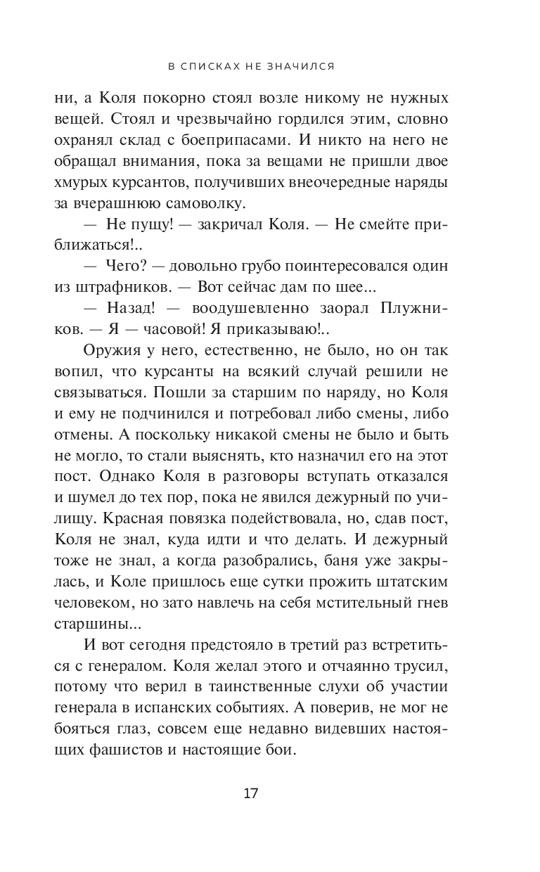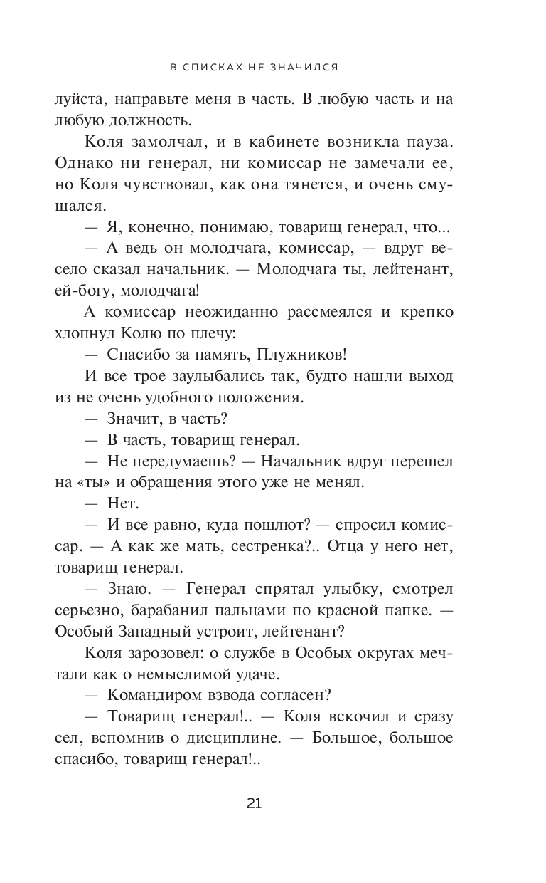 21 июня 1941 года молодой лейтенант Коля Плужников, получив назначение на постоянное место службы, приезжает в Брест. Переполненные залы ожидания вокзала и толпа увешанных багажом людей не настораживают охваченного радостными надеждами юношу. Коля спешит к месту расположения своей части – в Брестскую крепость… Солдата не успевают зачислить в личный состав военнослужащих, а в четыре утра раздаются артиллерийские разрывы – началась война. Так, не значась в списках, он принимает участие в первом в своей жизни бою, который продлится десять месяцев...