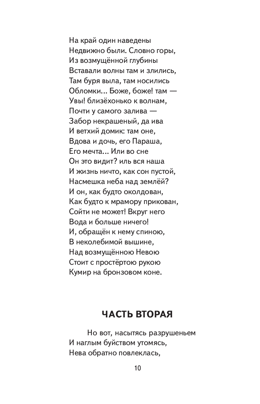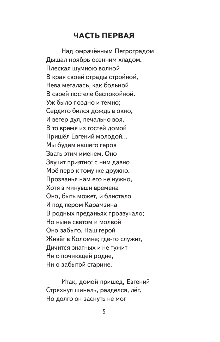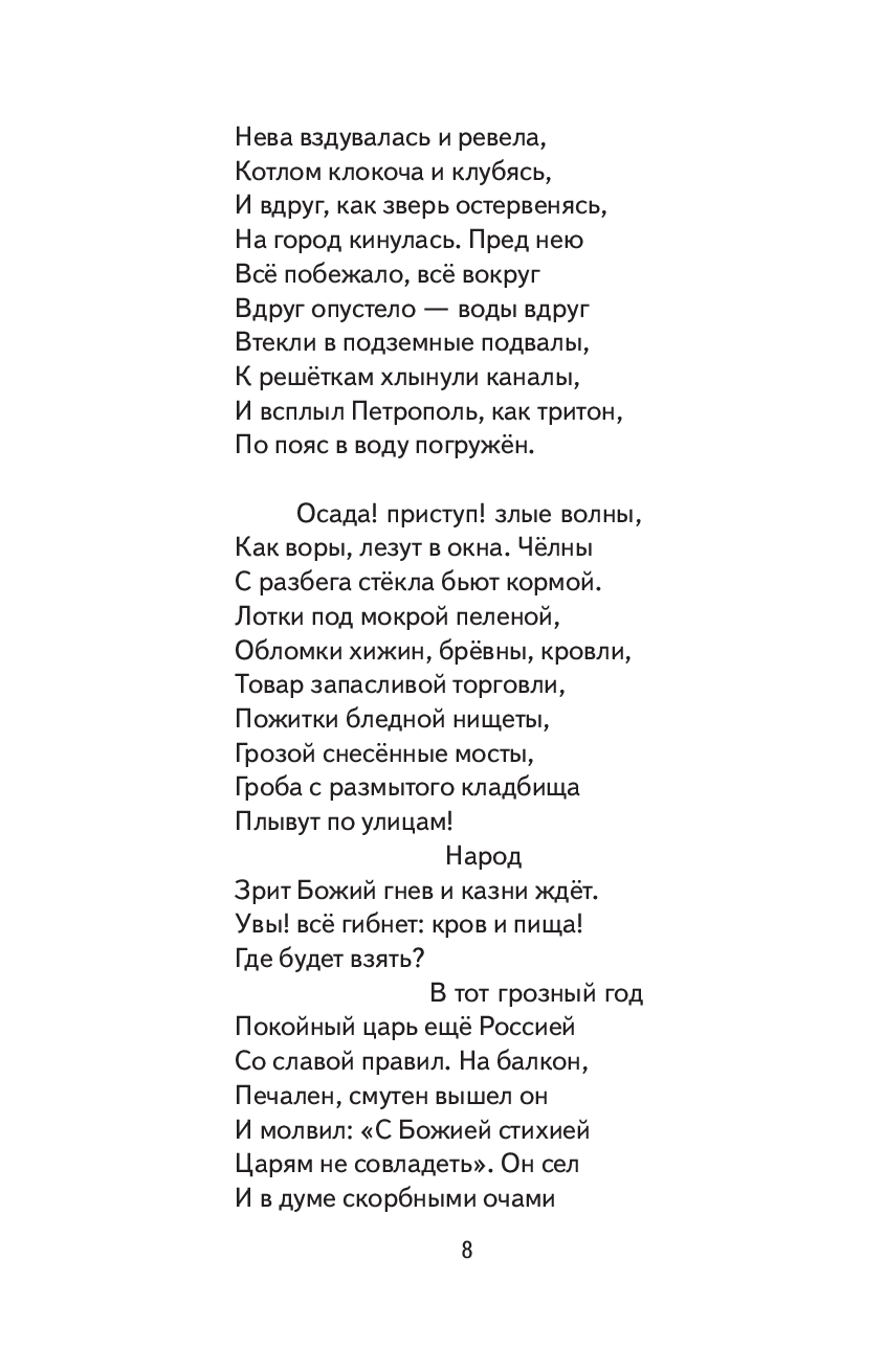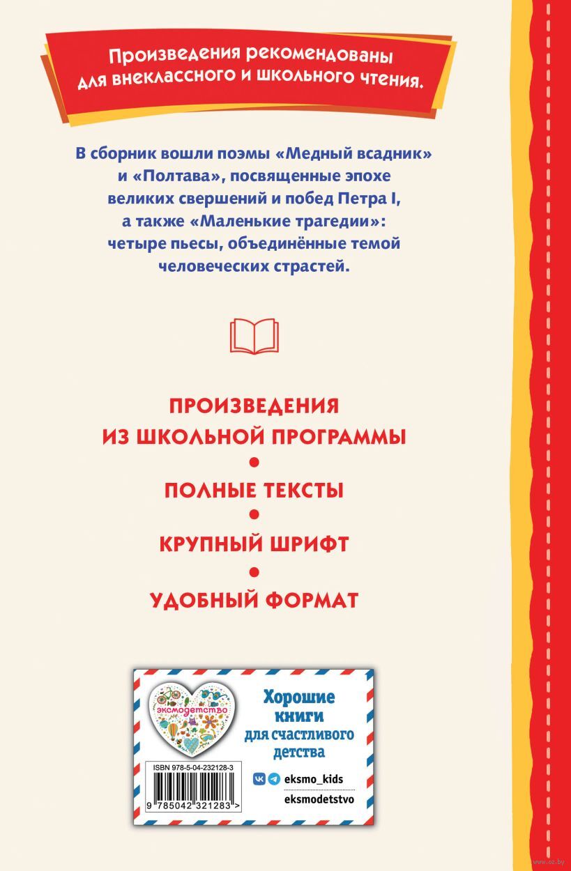 В сборник вошли поэмы А. С. Пушкина "Медный всадник" и "Полтава", а также четыре драматические произведения из цикла "Маленькие трагедии": "Скупой рыцарь", "Моцарт и Сальери", "Каменный гость", "Пир во время чумы". Иллюстрации Екатерины Комраковой.