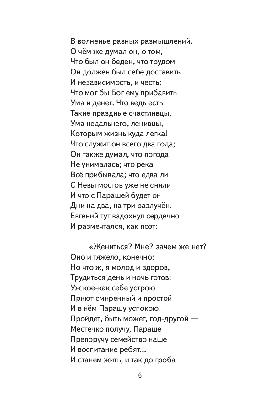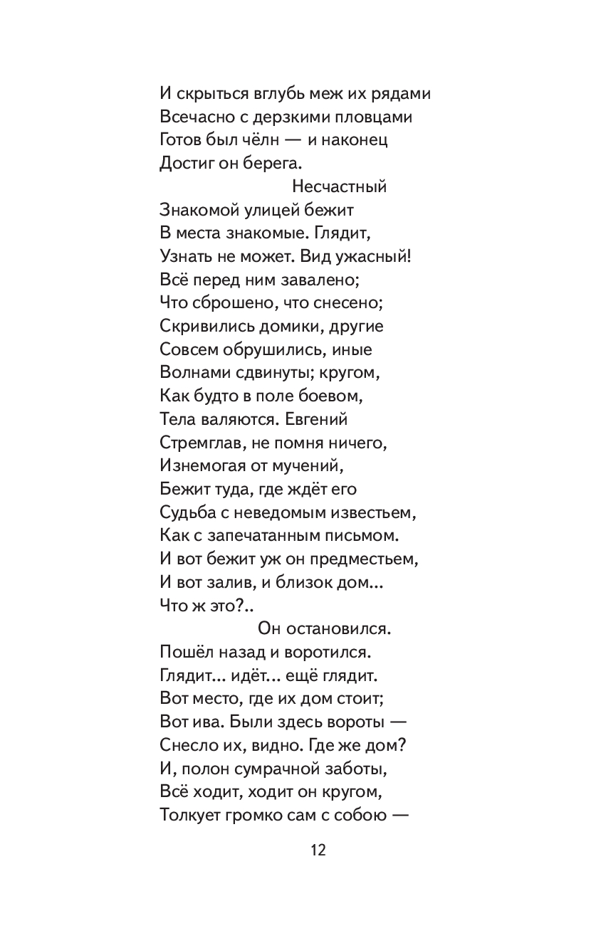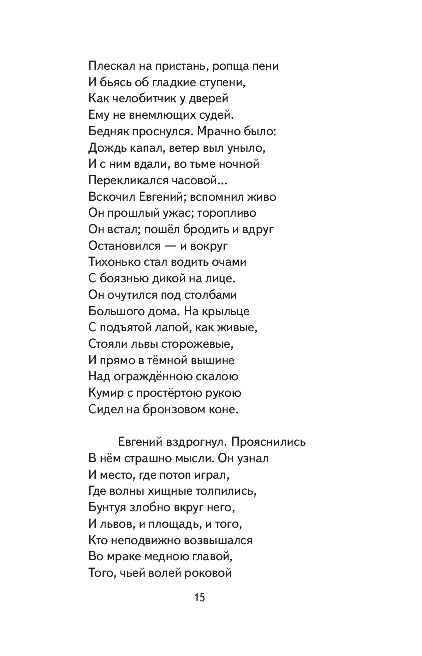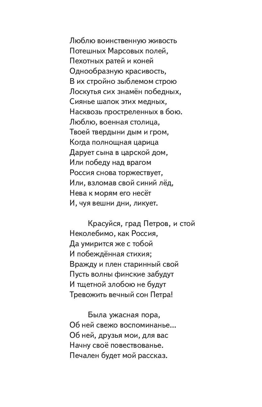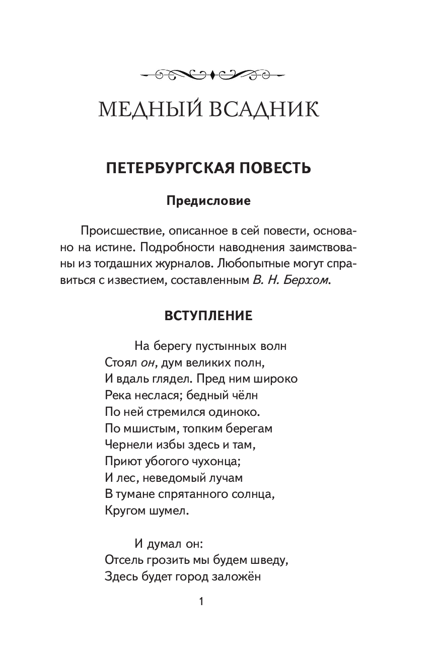 В сборник вошли поэмы А. С. Пушкина "Медный всадник" и "Полтава", а также четыре драматические произведения из цикла "Маленькие трагедии": "Скупой рыцарь", "Моцарт и Сальери", "Каменный гость", "Пир во время чумы". Иллюстрации Екатерины Комраковой.