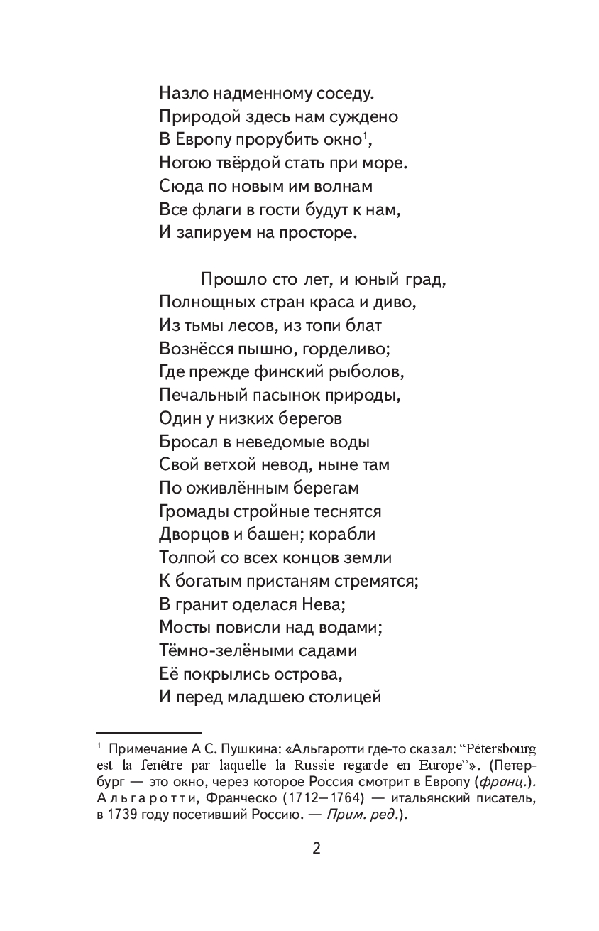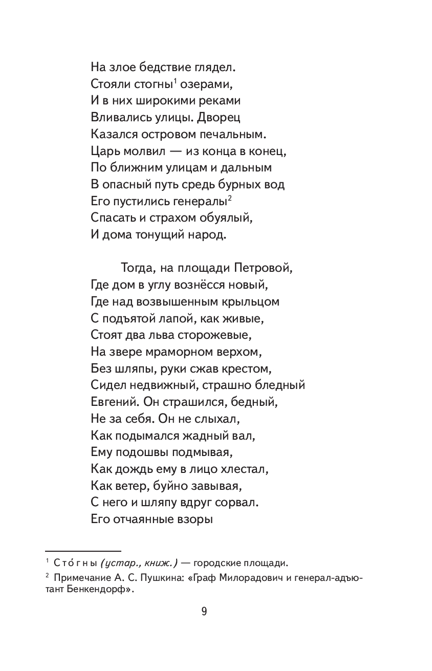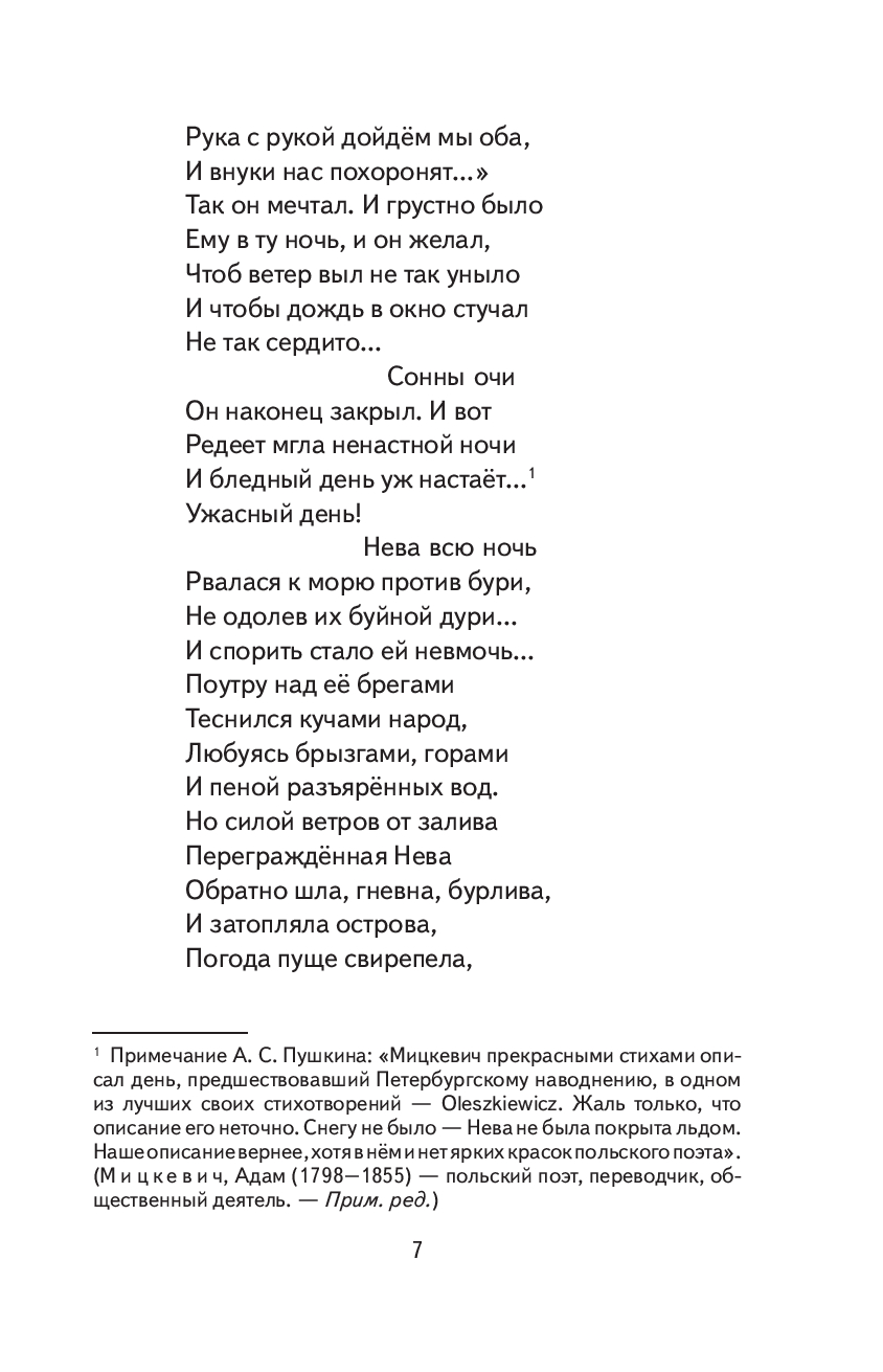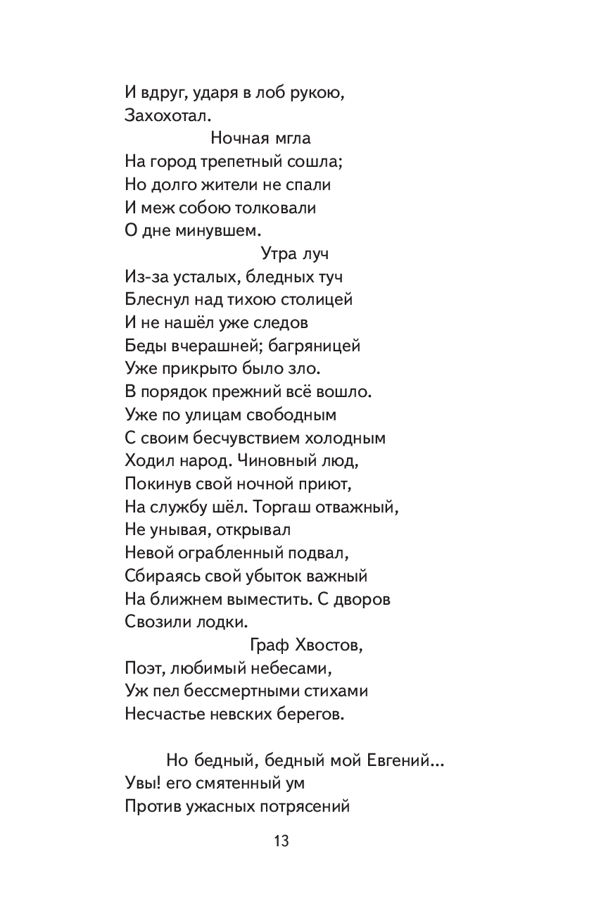 В сборник вошли поэмы А. С. Пушкина "Медный всадник" и "Полтава", а также четыре драматические произведения из цикла "Маленькие трагедии": "Скупой рыцарь", "Моцарт и Сальери", "Каменный гость", "Пир во время чумы". Иллюстрации Екатерины Комраковой.