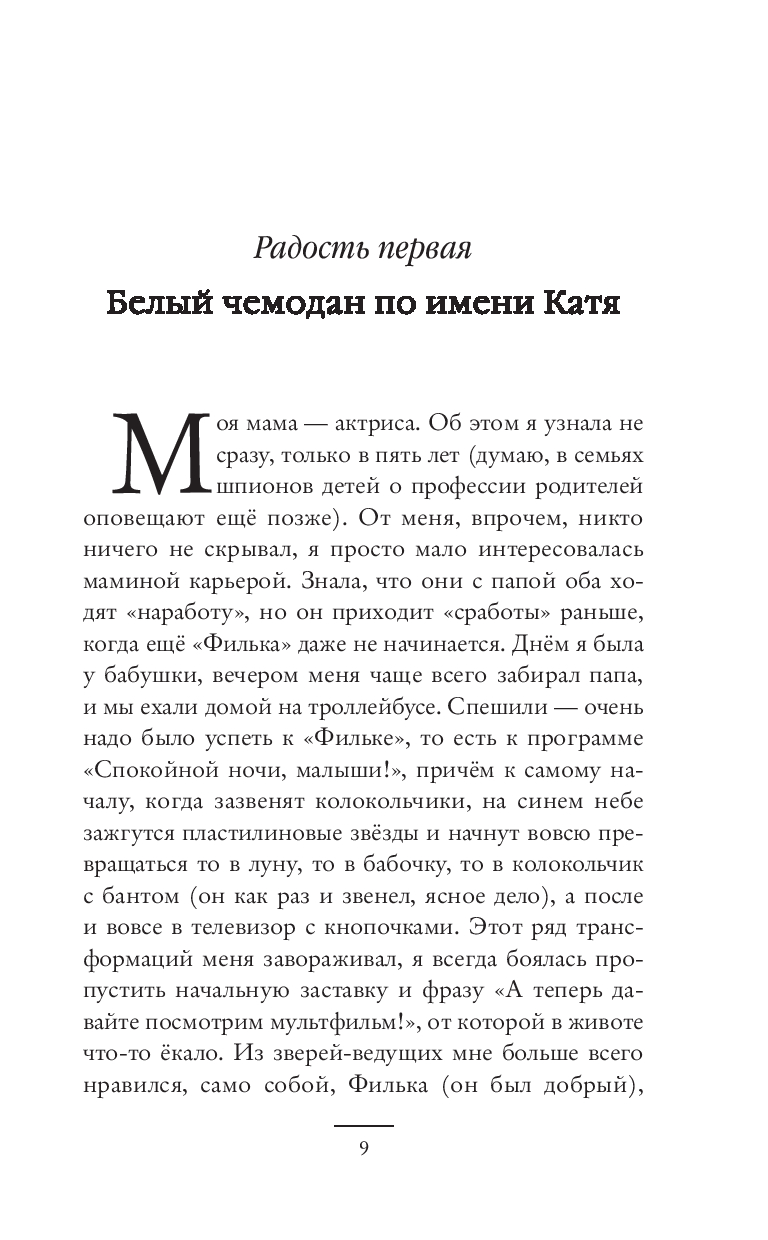 В первой части дилогии Ефросинья делится 13 минутами острой радости: от детских игр с белым чемоданом и трофейного батончика Mars до первых школьных влюбленностей, учебы на журфаке МГУ и настоящей дружбы.