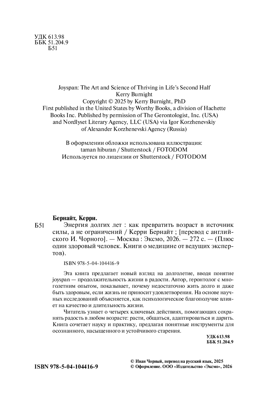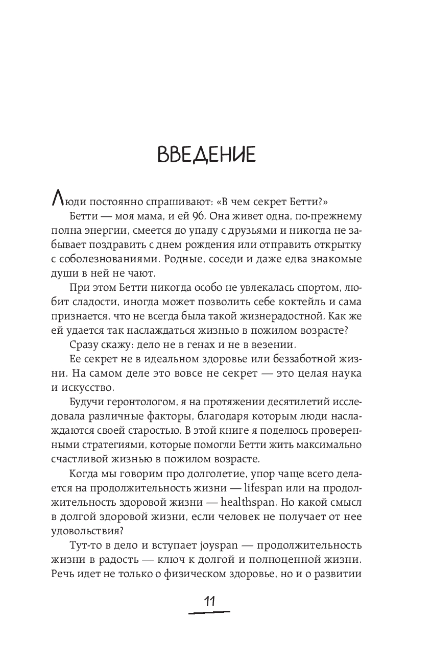 Эта книга предлагает новый, научно обоснованный взгляд на долголетие – joyspan, продолжительность жизни в радости. Доктор Керри Бернайт, геронтолог с десятилетиями практики и исследований, показывает: качество жизни зависит не только от здоровья, но и от того, как мы думаем, общаемся, меняемся и находим смысл.