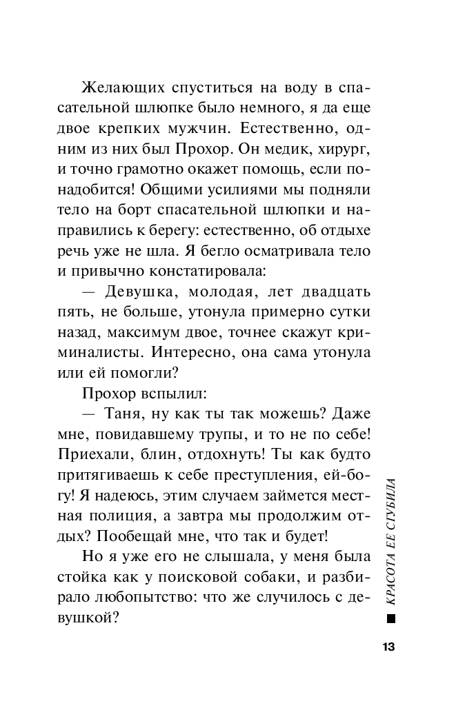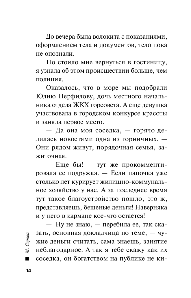 Частный детектив Татьяна Иванова приезжает в Крым на отдых со своим другом Прохором, надеясь на спокойный отпуск у моря. Однако планы рушатся, когда во время прогулки на яхте обнаруживают тело утонувшей молодой девушки – победительницы местного конкурса красоты и дочери влиятельного чиновника. Несмотря на заверения полиции о несчастном случае, отец погибшей убежден, что его дочь была убита. Татьяна погружается в запутанную историю, полную тайн, ревности и скрытых мотивов. Расследование приводит ее в мир иллюзий, порока и предательства, где за блеском и красотой скрываются шокирующие секреты. Ей предстоит рискнуть собственной жизнью, чтобы раскрыть правду...