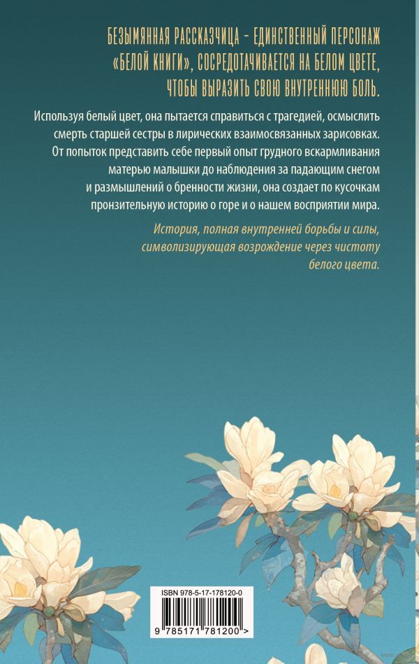 Безымянная рассказчица – единственный персонаж "Белой книги", сосредотачивается на белом цвете, чтобы выразить свою внутреннюю боль.