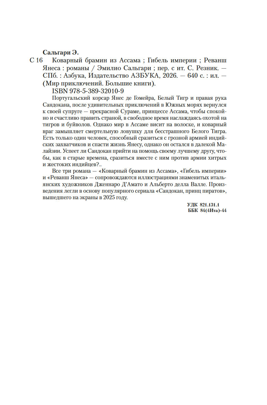Все три романа – "Коварный брамин из Ассама", "Гибель империи" и "Реванш Янеса" – сопровождаются иллюстрациями знаменитых итальянских художников Дженнаро Д’Амато и Альберто делла Валле. Произведения легли в основу популярного сериала "Сандокан, принц пиратов", вышедшего на экраны в 2025 году.
