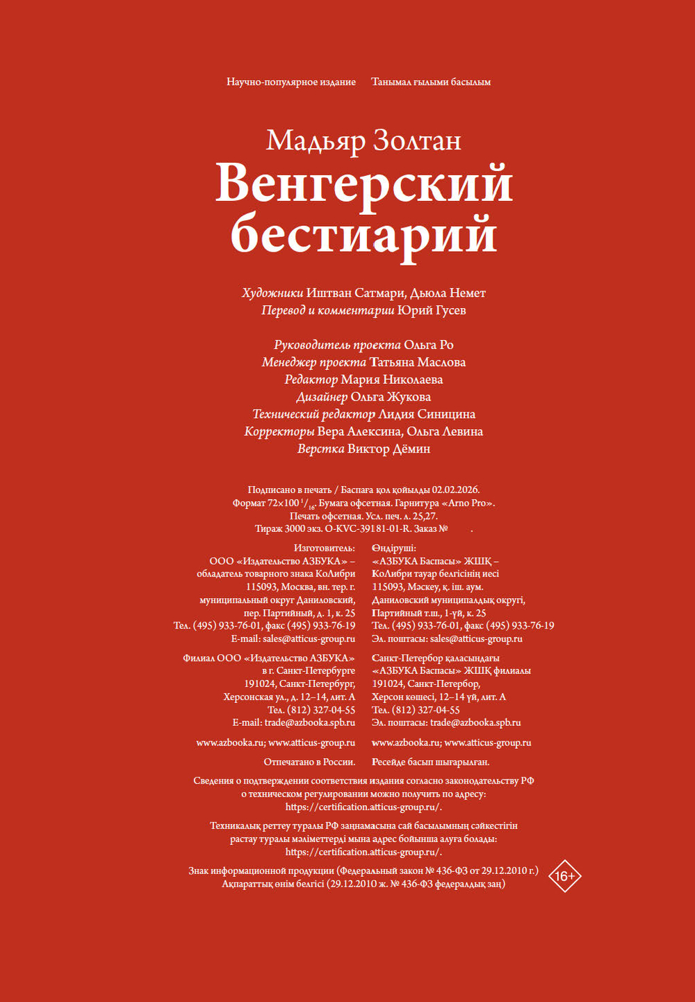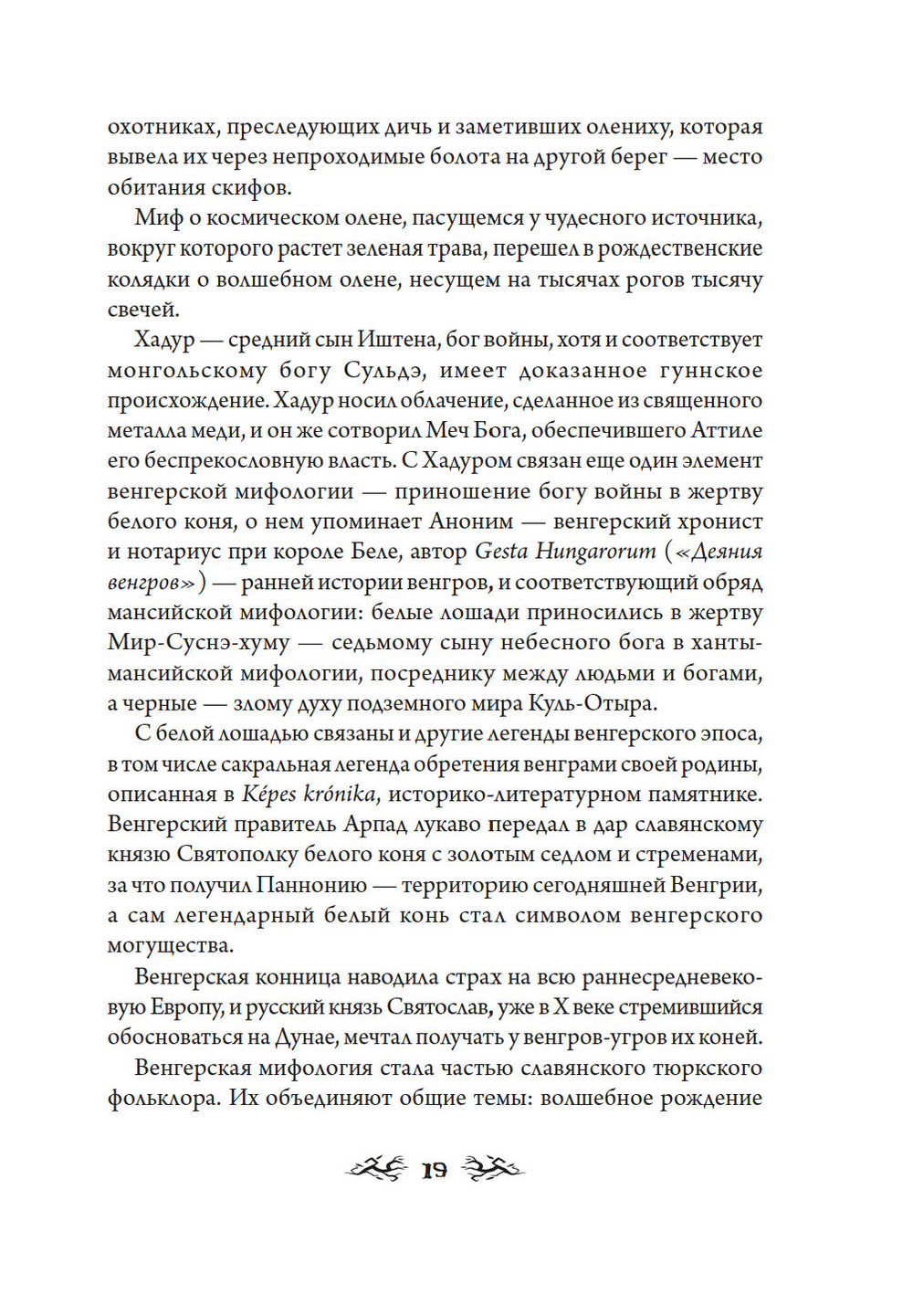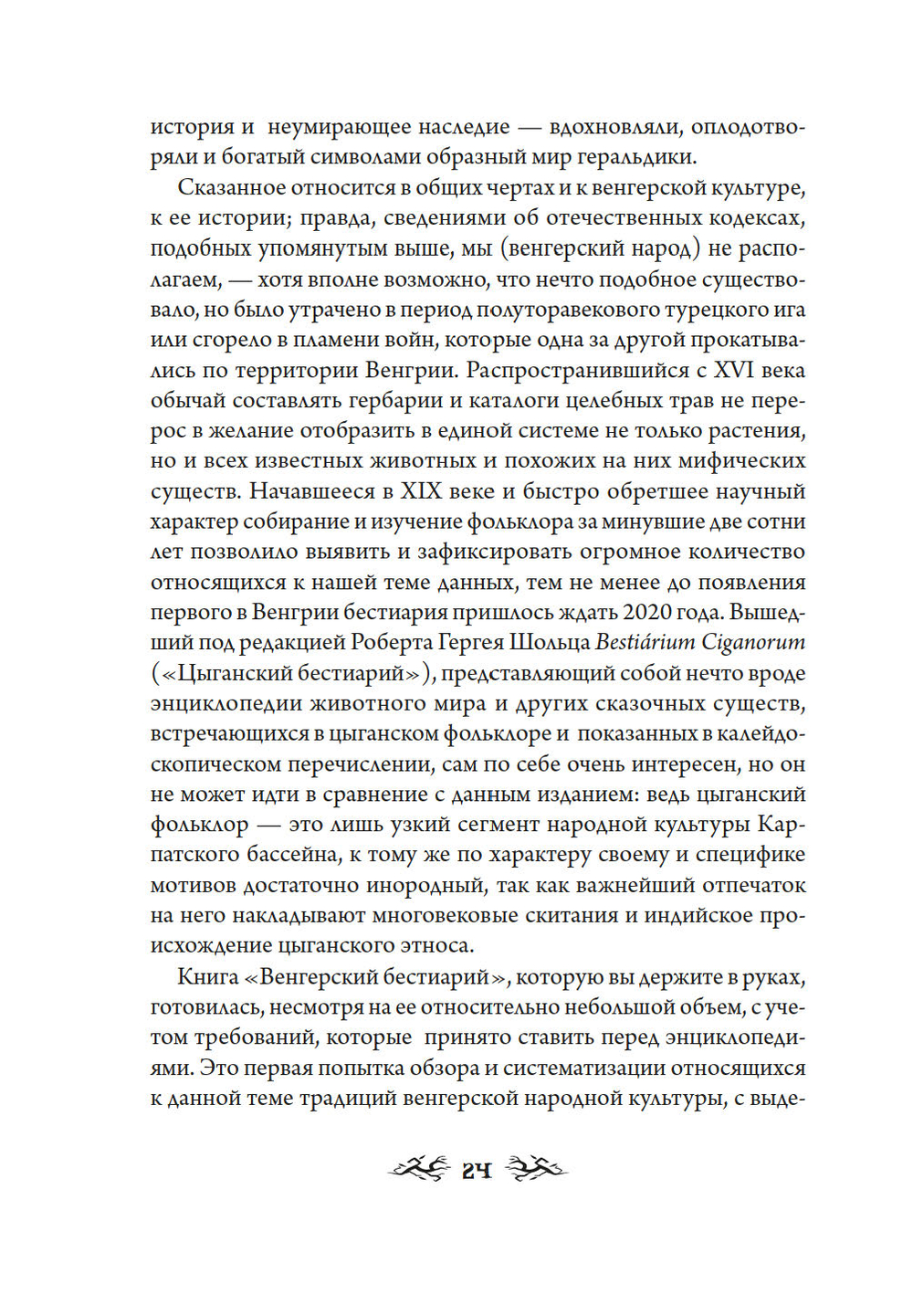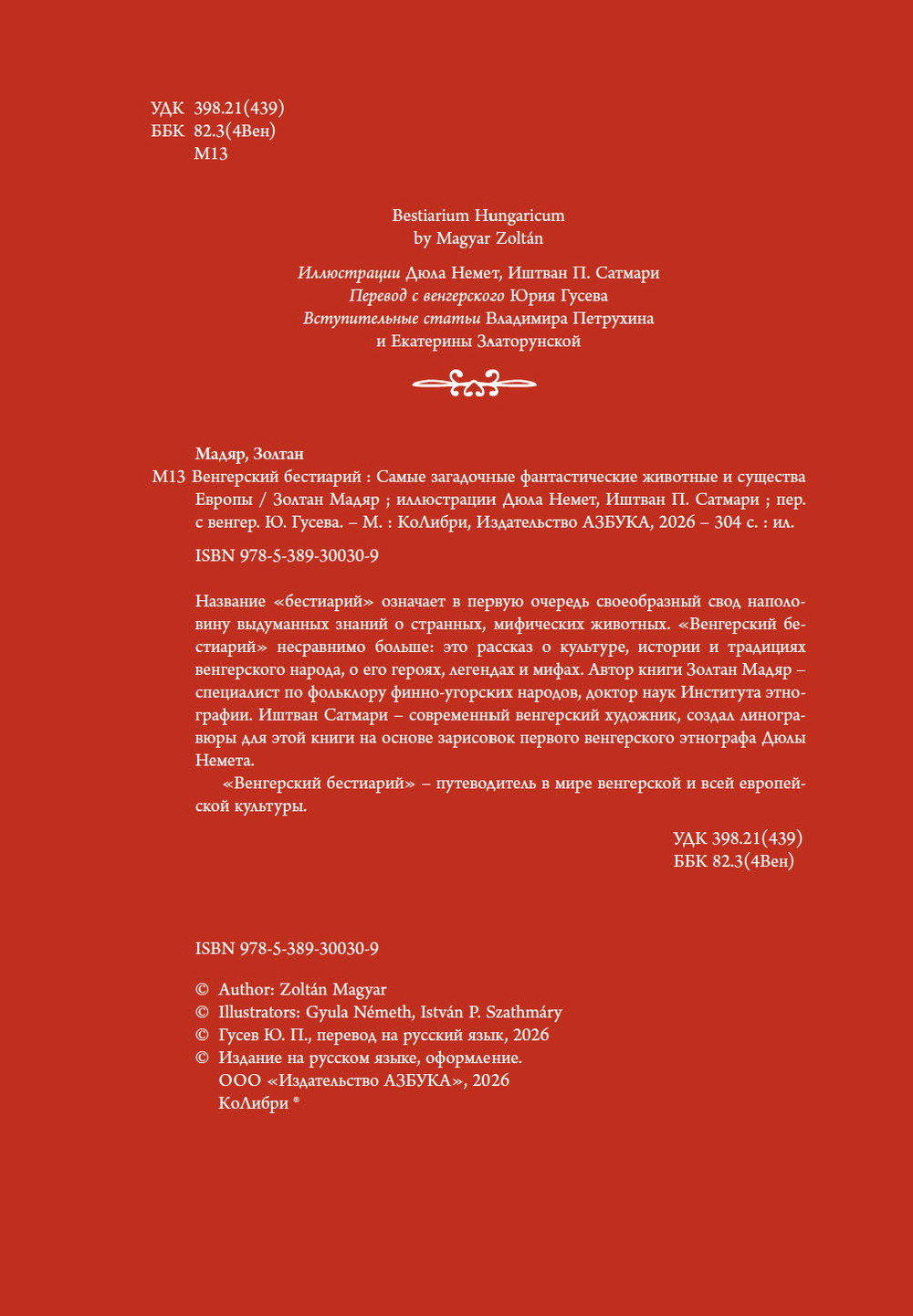 Название "бестиарий" означает, в первую очередь, своеобразный свод выдуманных сведений о странных, мифических животных. "Венгерский бестиарий" несравнимо больше – это рассказ о культуре, истории и традициях венгерского народа, о его героях, легендах и мифах. Автор книги Золтан Мадяр – специалист по фольклору финно-угорских народов, доктор наук Института этнографии. Иштван Сатмари – современный венгерский художник, создал линогравюры для этой книги на основе зарисовок первого венгерского этнографа Дюлы Немета.