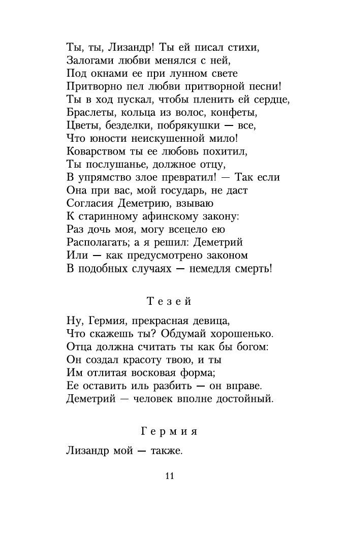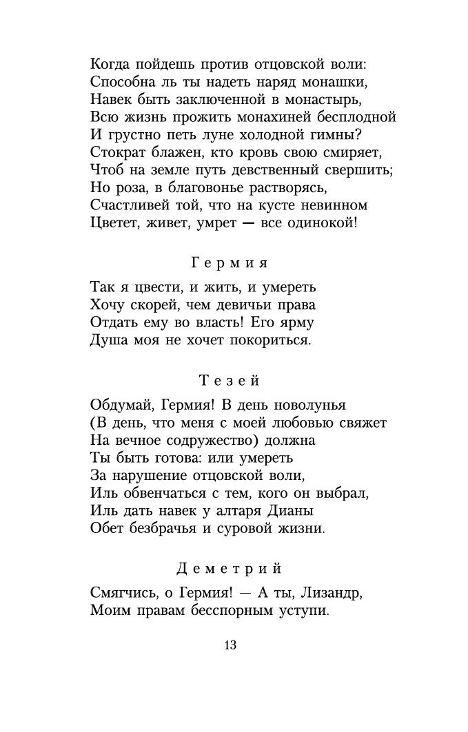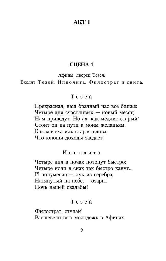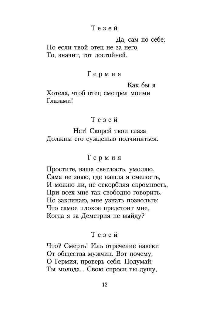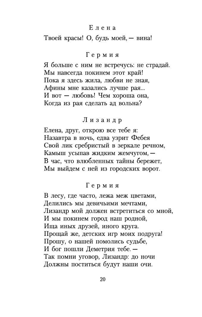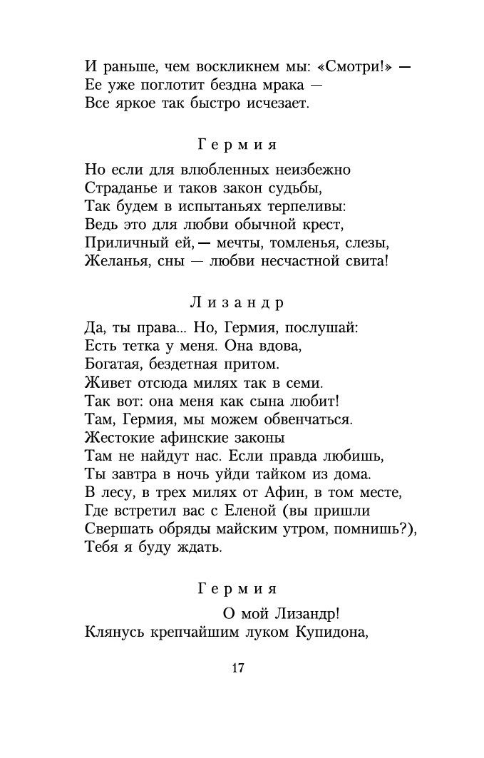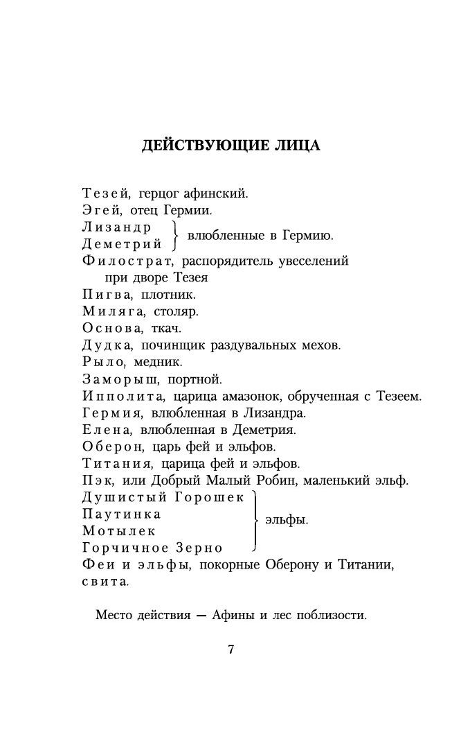 В книгу включена знаменитая шекспировская комедия об изменчивости любви, в сюжете которой мир древних Афин соседствует с фантастическим миром эльфов, а персонажи английского фольклора и средневековых рыцарских романов – с образами "Метаморфоз" Овидия. Герои пьесы, пребывающие в озаренном луной зачарованном летнем лесу, становятся игрушками фортуны и совершают необычные, причудливые, экстравагантные поступки. Магия волшебного цветка, сок которого внушает человеку безоглядную любовь к первому встречному, становится причиной удивительных превращений и вереницы трагикомических недоразумений; однако власть могущественного короля эльфов Оберона приводит события, как и положено в комедии, к счастливому концу.