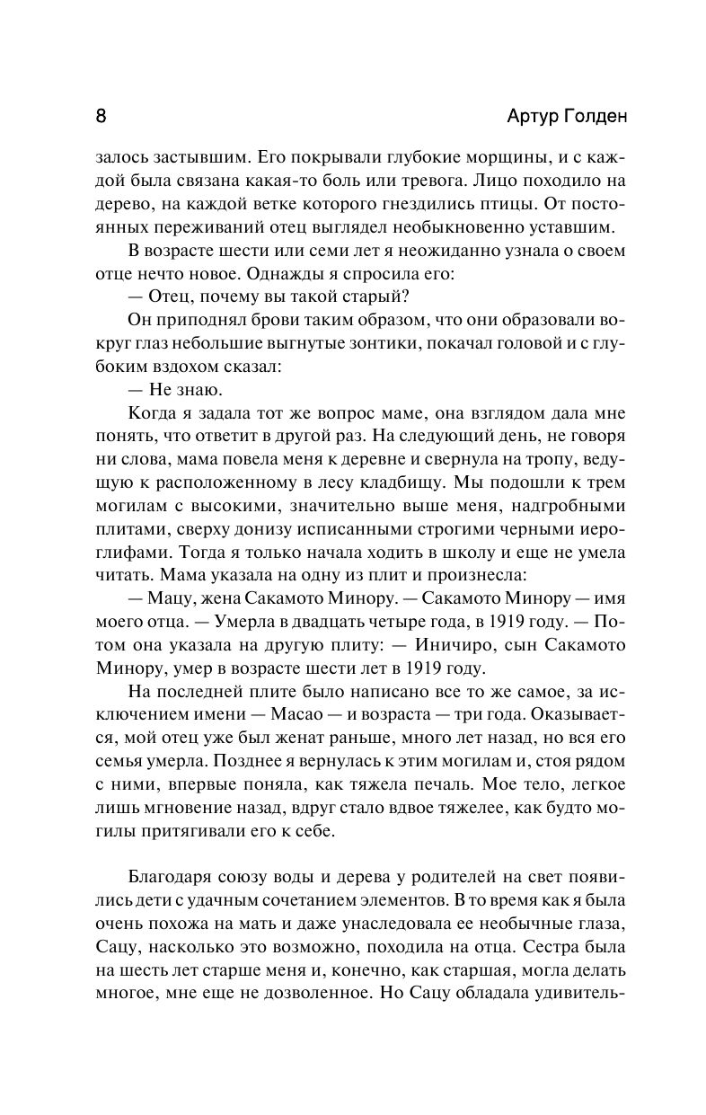 Она изящна и остроумна, элегантна и артистична. Ее профессия – развлекать и очаровывать. Но вступать в связь с клиентом ей запрещено, а полюбить кого-то из них считается позором. Перед вами – история Саюри, девушки из простой крестьянской семьи, ставшей королевой гейш Киото. История вражды и соперничества, изощренных женских интриг и великой, пронесенной через десятилетия любви, ради которой Саюри дерзнула нарушить закон гейш... Читайте роман, положенный в основу легендарного голливудского фильма Роба Маршала с Кеном Ватанабе, Мишель Йео, Гун Ли и Чжан Цзы в главных ролях!