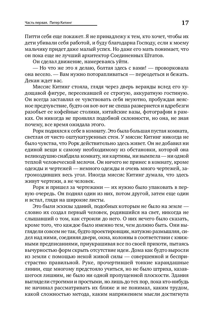 Главные герои романа – архитектор Говард Рорк и журналистка Доминик Франкон – отстаивают свободу творческой личности в борьбе с обществом, где ценят "равные возможности" для всех. Вместе и поодиночке, друг с другом и друг против друга, но всегда – наперекор устоям толпы. Они – индивидуалисты, их миссия – творить и преобразовывать мир. Через перипетии судеб героев и увлекательный сюжет автор проводит главную идею книги – ЭГО является источником прогресса человечества.