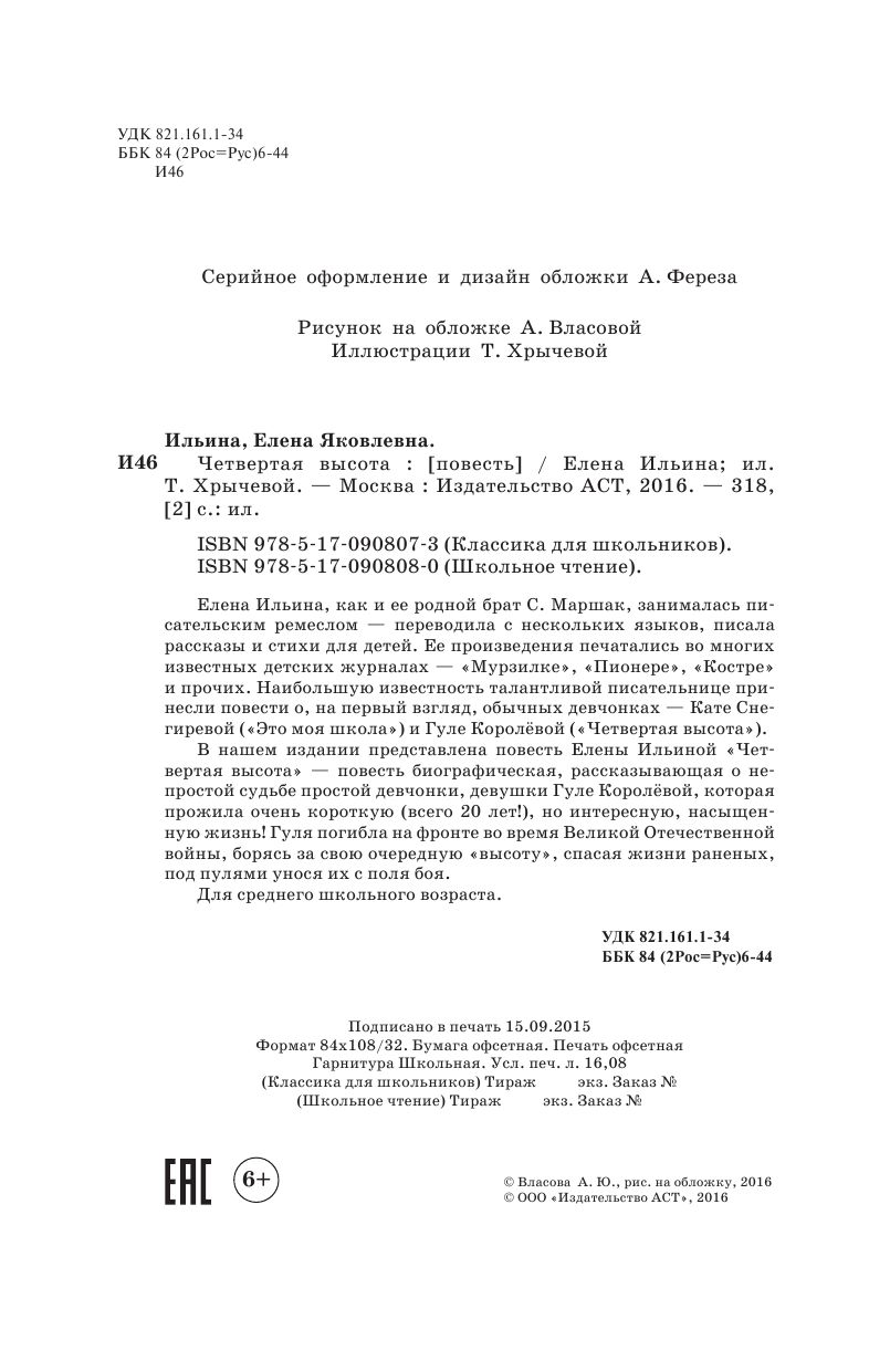 В нашем издании представлена повесть Елены Ильиной "Четвертая высота" – повесть биографическая, рассказывающая о непростой судьбе простой девчонки, девушки Гуле Королёвой, которая прожила очень короткую (всего 20 лет!), но интересную, насыщенную жизнь! Гуля погибла на фронте во время Великой Отечественной войны, борясь за свою очередную «высоту», спасая жизни раненых, под пулями унося их с поля боя.