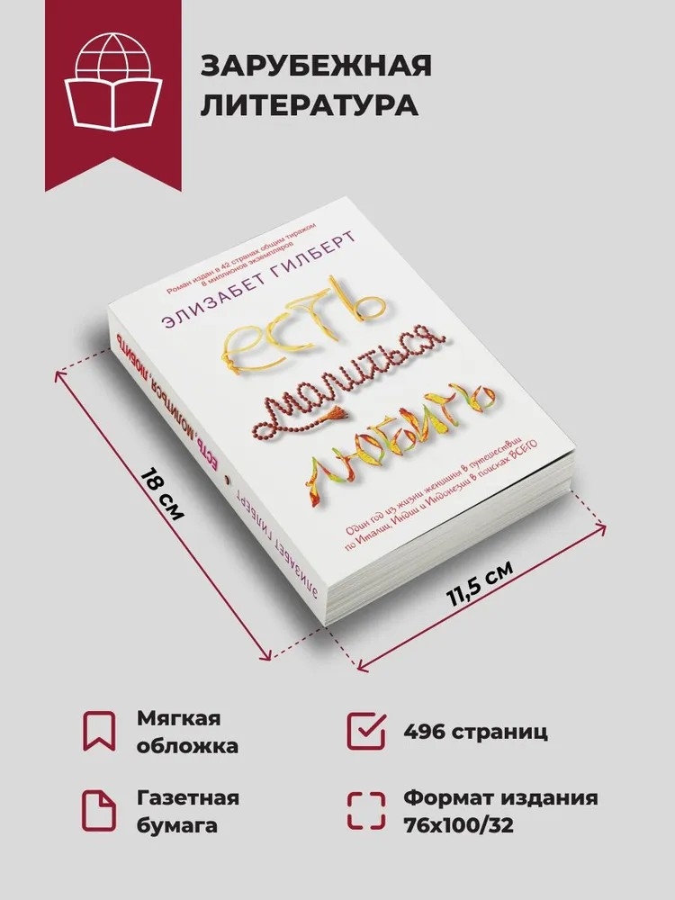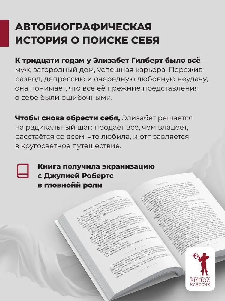 Это мемуары, описывающие путешествие автора после того, как ее брак распался. Автор рассказывает в книге, как искала себя сначала в Италии, затем в Индии, затем на Бали. Читатель узнает много подробностей жизни в этих странах. Эту добрую и светлую книгу можно отнести как к художественной литературе, так и к книгам о самосовершенствовании и личностном росте. Книга о том, каково быть женщиной, что есть работа и есть ли выбор. Отличная книга о поисках себя.