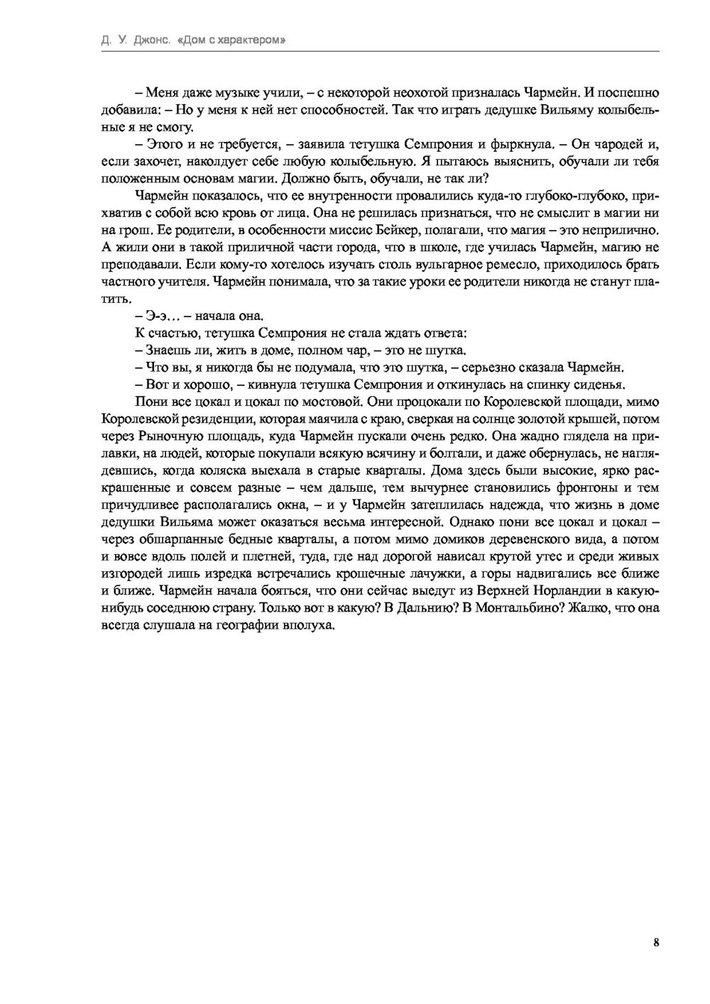 В доме придворного чародея Вильяма Норланда пространство и время ведут себя по своим, чародейским законам. Единственная дверь ведёт куда угодно – и в спальни, и в кухню, и в горные пещеры, и в прошлое, и в королевскую библиотеку. Родственница чародея, юная Чармейн, волей-неволей вынуждена разбираться, как устроен дом с характером, – и в результате оказывается в гуще придворных интриг. Добрый король и его дочь пытаются выяснить, отчего королевство пришло в упадок, и найти утраченный Эльфийский Дар, а для этого зовут на помощь могущественную колдунью Софи – да-да, ту самую, уже знакомую читателям по "Ходячему" и "Воздушному замку", – и она прибывает ко двору в сопровождении огненного демона Кальцифера и двух очаровательных маленьких мальчиков, один из которых – её сынишка Морган, а вот второй приготовил всем сюрприз...