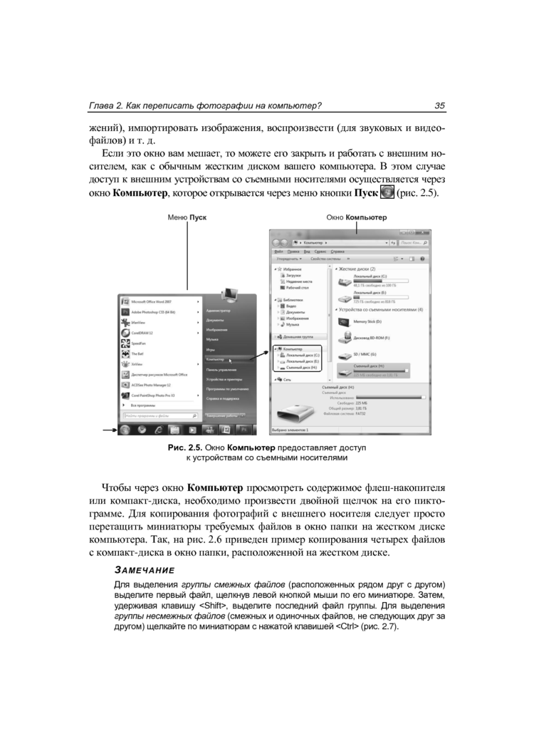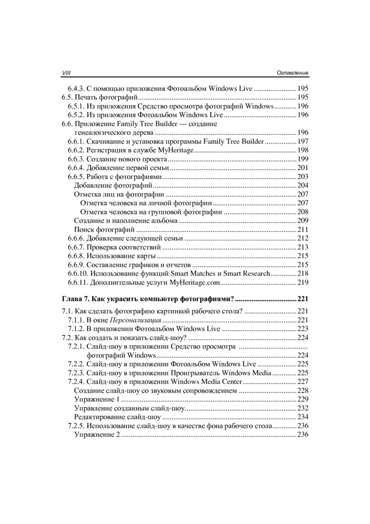 Книга представляет собой сборник практических рекомендаций, необходимых начинающему пользователю любого возраста для работы на компьютере с фотографиями, звуком и видео. Рассмотрены как «родные» приложения операционной системы Windows, так и программы сторонних производителей. На простых примерах описаны основные операции по обработке фотографий, создание фоторамок, коллажей и календарей. Показано, как сформировать фотоальбом, видео-, и фонотеку. Уделено внимание использованию изображений для создания генеалогического дерева. Рассмотрена технология создания собственного фильма, а также оцифровки старых аудио- и видеокассет. Отдельная глава посвящена воспроизведению компьютерной информации на современных телевизорах. К книге прилагается компакт-диск с исходными файлами, необходимыми для выполнения упражнений, а также с пробным и бесплатным программным обеспечением.