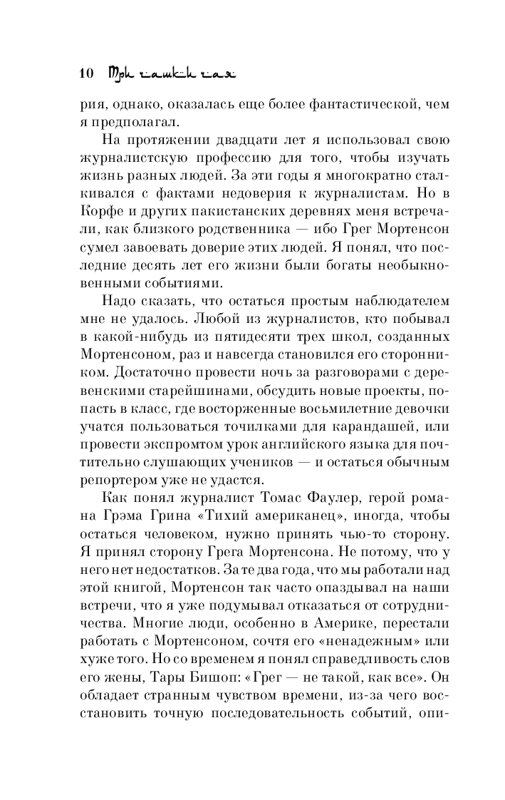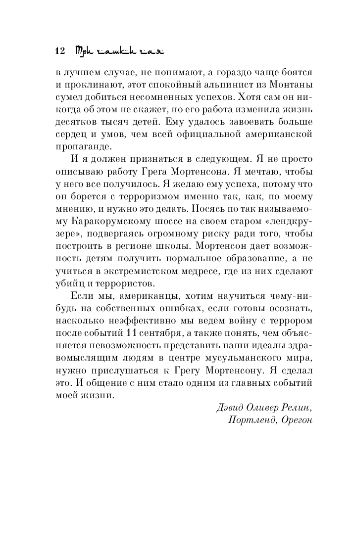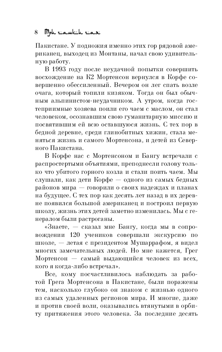 "Три чашки чая" – это поразительная история о том, как самый обычный человек, не обладая ничем кроме решительности, способен в одиночку изменить мир.