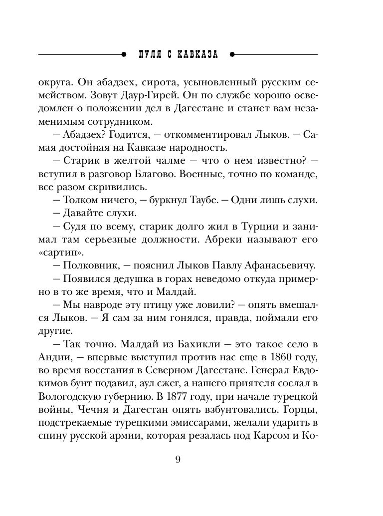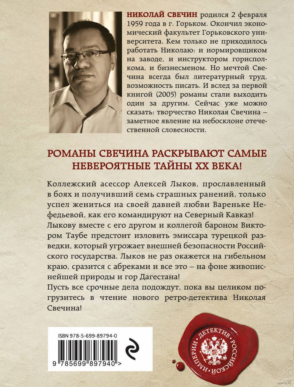 Лыкову вместе с его другом и коллегой бароном Виктором Таубе предстоит изловить эмиссара турецкой разведки, который угрожает внешней безопасности Российского Государства. Лыков не раз окажется на гибельном краю, сразится с абреками и все это – на фоне живописнейшей природы и гор Дагестана.