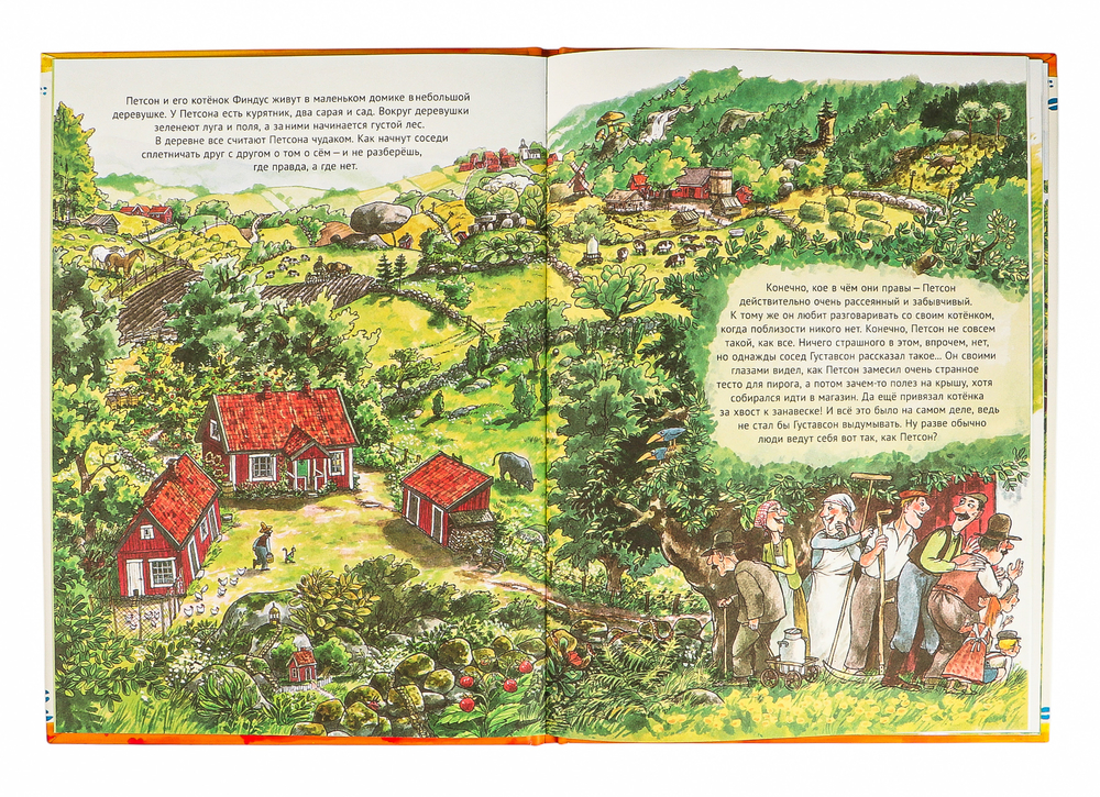 Петсон и его котенок Финдус живут в маленьком домике в небольшой деревушке. У Петсона есть курятник, два сарая и сад. Вокруг деревушки зеленеют луга и поля, а за ними начинается густой лес.