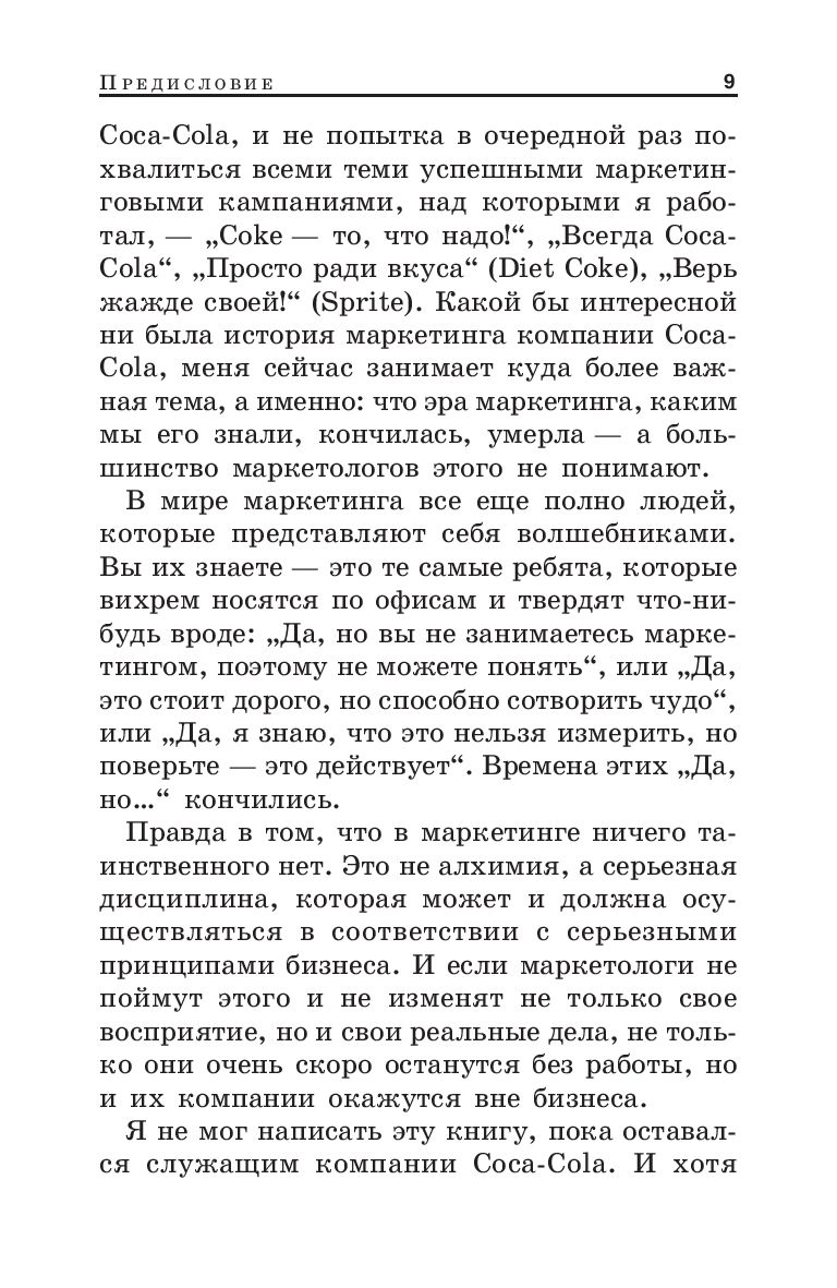 В книге "Конец маркетинга, каким мы его знаем" Серхио Займан раскрывает рациональные, зачастую провокационные стратегические и тактические приёмы маркетинга, которые всего за 5 лет помогли ему увеличить рыночную стоимость компании "Coca-Cola" с 56 до 193 миллиардов долларов. Подвергая критике традицию создания рекламы и образов, которые так нравятся толпе, автор объясняет, почему "трогающий сердца" маркетинг лишён смысла, если не приводит к увеличению объёма продаж.