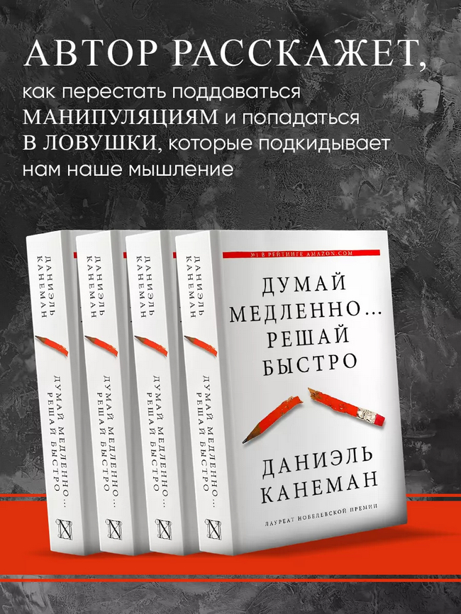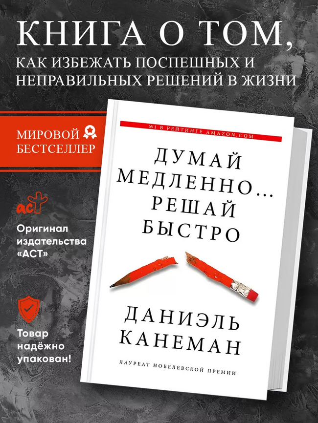 Прочитала книгу в оригинале на английском. Название книги переведено не верно и не учит принимать быстрые решения, как может показаться из русскоязычного названия. Книга не простая. Некоторые главы читаются очень тяжело. Но она стоит того, так как даёт ряд четких представлений о процессе принятия решений. Сделала ряд выводов для себя и даже записала их, чтобы эти мысли и тезисы были перед глазами. Хотя многие из идей могут показаться на первый взгляд очевидными вещами. Например то, что люди больше стараются, чтобы не допустить потерю своего ресурса, чем получить новый. Вроде все ясно тут, но когда ты видишь научную и экспериментальную обоснованность этого факта, ты понимаешь, как глубоко это в нас зашито. И с этим знанием можно смело работать и использовать его на практике. Через годик прочту русский вариант для закрепления эффекта