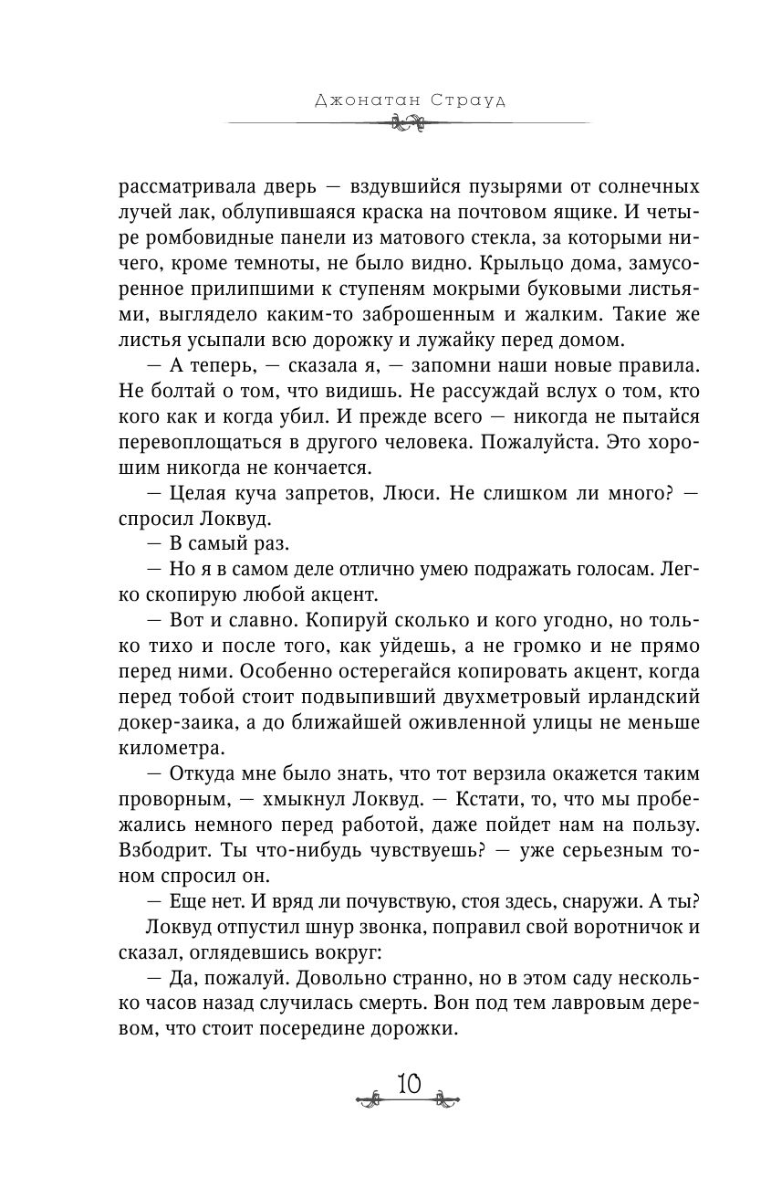 Просто великолепная книга! Как только начала читать серию, сразу же в нее влюбилась! Персонажи описаны с такой точностью, что их очень просто представить в голове. При этом меня приятно удивляет как Джонатан пишет от лица девушки-подростка и при этом ничего не преувеличивает. Все сверхъестественные феномены и прочие приключения описаны так, что появляется ощущение, будто сам находишься бок о бок с Энтони и Люси с рапирой в одной руке, а в другой с солевой бомбой. Могу восхищаться этой серией книг еще очень долго. 5 из 5