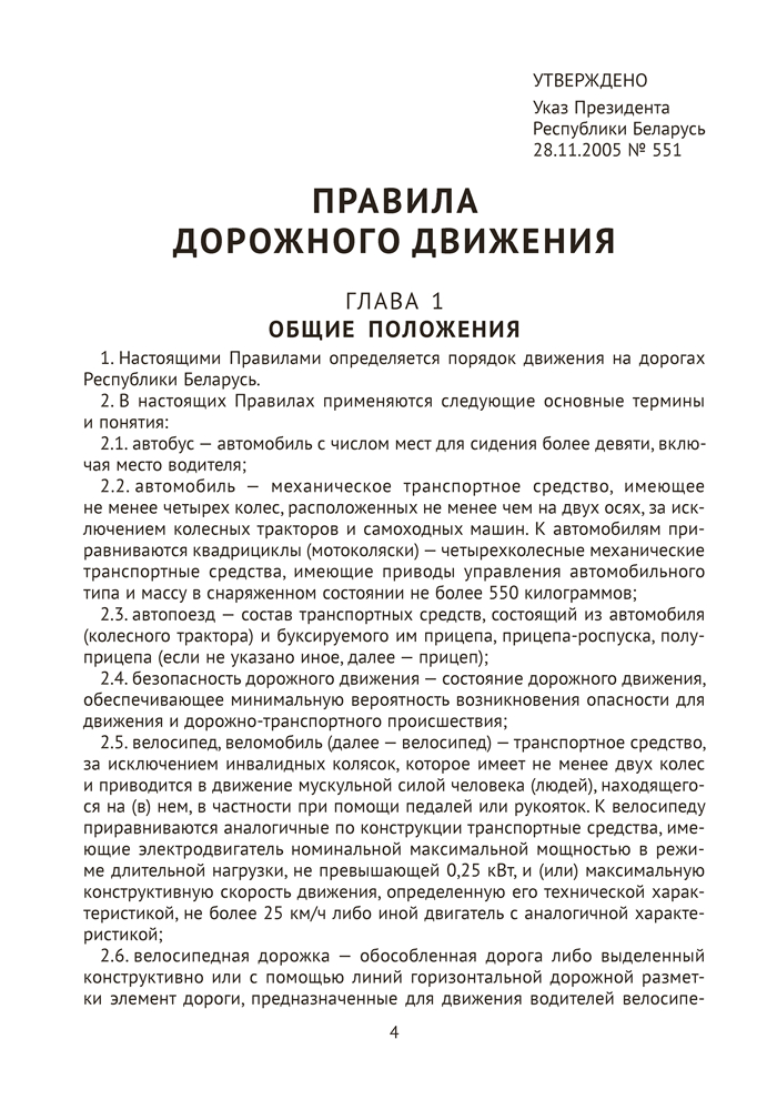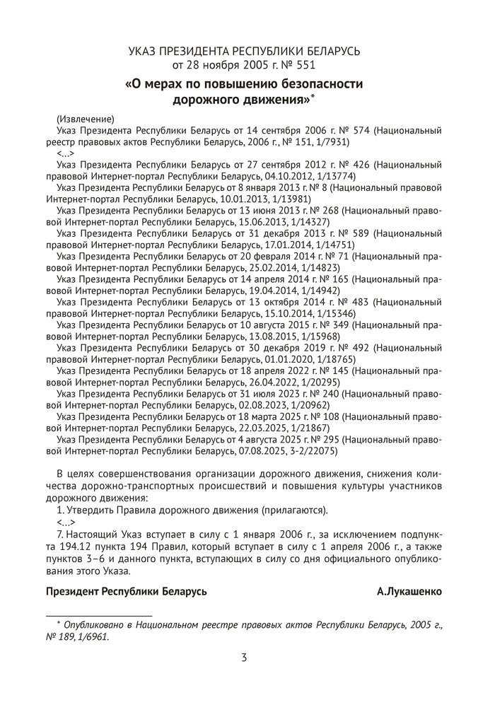 В издание включены Правила дорожного движения, утвержденные Указом Президента Республики Беларусь от 28 ноября 2005 г. № 551 "О мерах по повышению безопасности дорожного движения", с изменениями, внесенными Указом Президента Республики Беларусь от 4 августа 2025 г. № 295 "Об изменении Указа Президента Республики Беларусь" и вступающими в силу с 1 сентября 2025 г. Также издание содержит нормы административной ответственности за правонарушения в области дорожного движения.