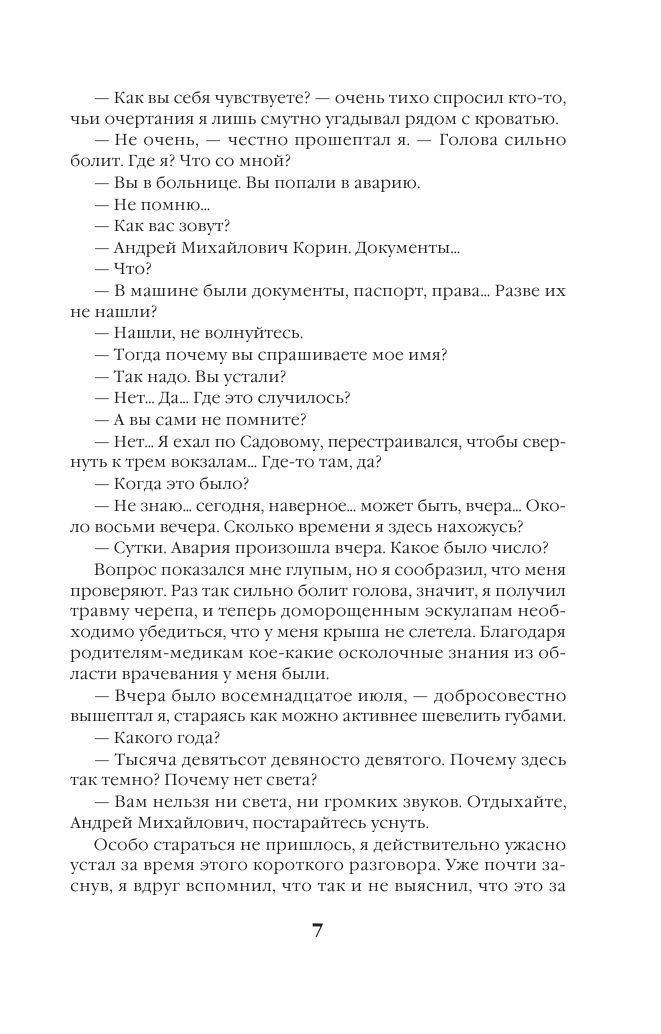 Почти два напряженных и плодотворных года жизни выпали из памяти преуспевающего писателя Андрея Корина. Считается, что это последствия автокатастрофы. Но чем энергичнее пытается Андрей восстановить утраченное время, тем очевиднее – причина гораздо глубже. Словно в зеркало вглядывается он в окружающих, по крохам собирая свое прошлое. И все чаще взгляд его обращается на самого себя, ибо именно в нем таится причина этой странной амнезии. Какой поступок в прошлом заставил Андрея вытеснить из памяти кусок жизни? Кто вокруг – друзья или враги? Откуда исходит опасность – ведь на него дважды покушались? И что откроется взору, когда его память внезапно прозреет?..
