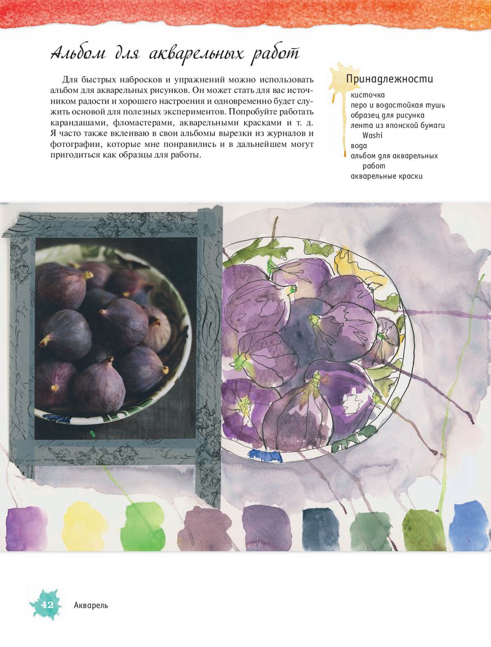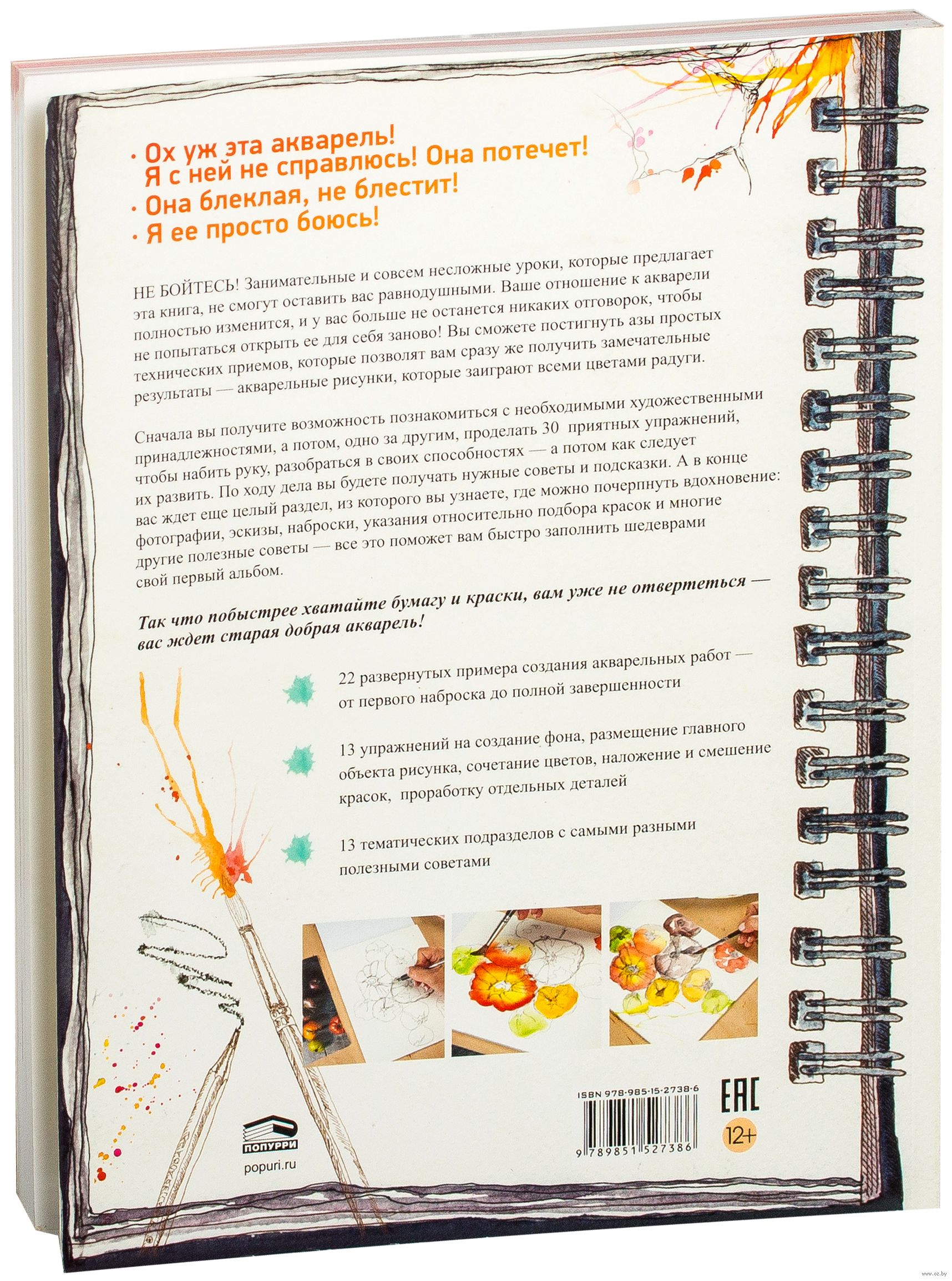 Автор даёт более двух десятков развёрнутых примеров создания акварельных работ: от первого линейного наброска до полной завершённости, предлагает упражнения на создание фона, размещение главного изображения, наложение и смешение красок и отработку отдельных деталей.