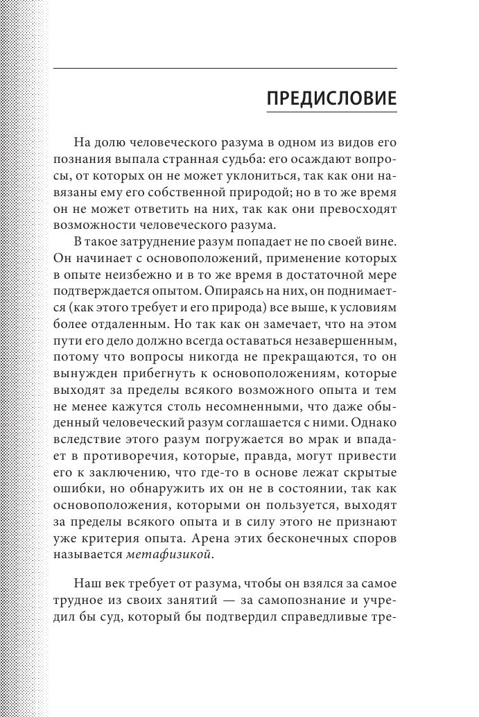 Иммануил Кант (1724-1804) – великий философ, родоначальник немецкой классической философии. Его труд "Критика чистого разума" является главным сочинением философа и одной из фундаментальных работ в истории философии. "Критика чистого разума" не представляет собой одну стройно выстроенную систему, она скорее является изложением попыток Канта сформулировать и разрешить те проблемные вопросы, которые возникают в процессе исследования. Кант обдумывал свой труд несколько десятилетий, а писал несколько месяцев, по его собственному признанию, не очень задумываясь над ясностью изложения своих идей. Так что не зря уже первые читатели были обескуражены излишней сложностью и запутанностью этой работы. Представляем читателю сжатый до основных положений концентрат этого непосильного для прочтения современным человеком научного труда.