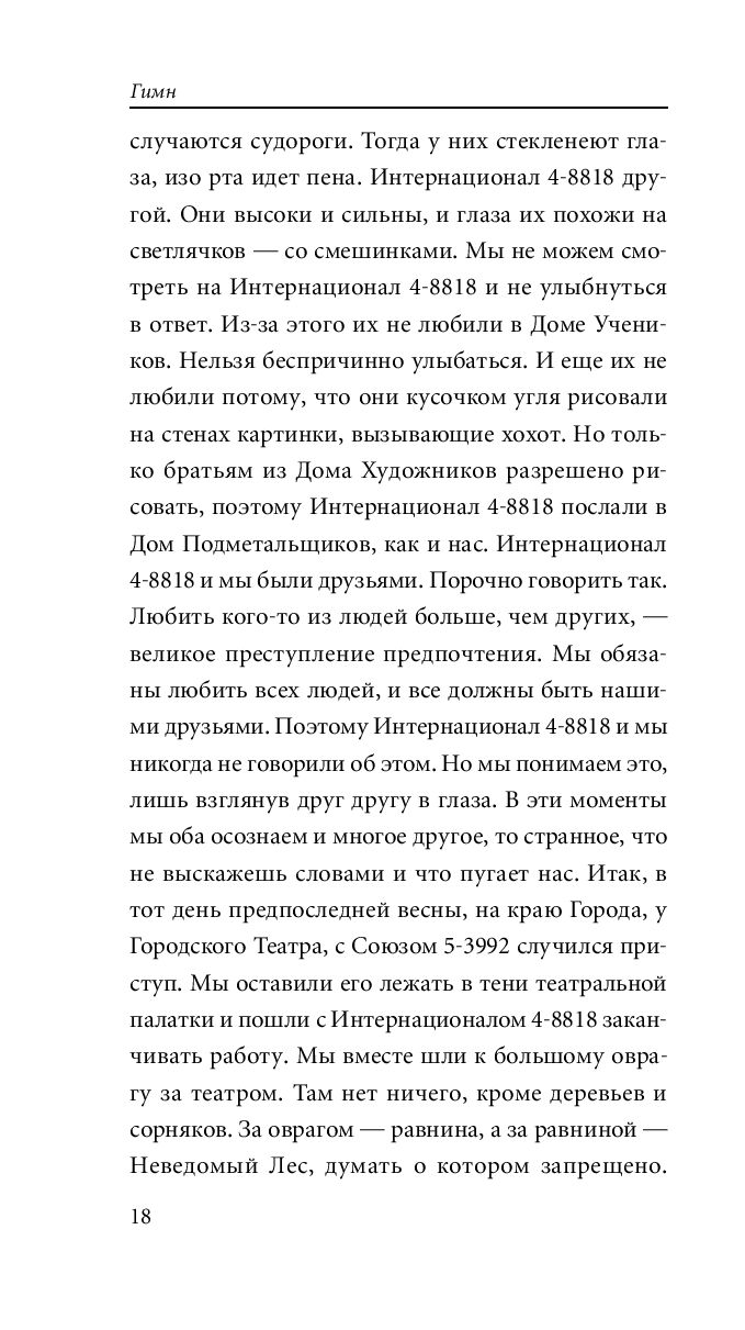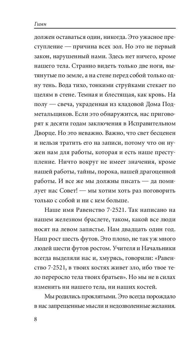 Отрывок из 11 главы Я есть. Я думаю. Я хочу. Мои руки. Моя душа. Моё небо. Мой лес. Это моя земля. Разве можно сказать больше? Это самые важные слова. Это ответ. Я стою здесь, на вершине горы. Я поднимаю руки, развожу их в стороны. Это моё тело и моя душа. Наконец я понял. Мы хотели осмыслить всё это. Я и есть этот смысл. Мы хотели найти оправдание своему существованию. Но оправдание - я сам. Мне не нужно ни оправдание, ни одобрения. Мои глаза видят, и они дарятмиру красоту. Мои уши слышат, и в них звучит песня. Мой мозг думает, и только он будет тем лучом, который осветит правду. моя воля выбирает, и выбор её - единственный мне указ, единственное, что я уважаю. Многие слова открыты мне. Многие из них мудры, другие лживы, но только три святы: "Я хочу этого". Какой бы дорогой я не шел, путеводная звезда во мне, и звезда, и компас, они укажут мне её, укажут мне дорогу к самому себе. Не знаю, есть ли земля, на которой я стою, сердце вселенной или только пушинка, затерянная в вечности. Не знаю и не думаю об этом. Ведь я знаю, что счастье возможно для меня на земле. И моему счастью не нужно высокой цели для оправдания себя. Оно - не средство для достижения цели. Оно и есть цель. И я не есть средство для достижения целей других. Я не служу ничьим желаниям. Я не бинт для их ран. Я не жертва на их алтарях. Я человек. Этим чудом своего существования владею лишь я, лишь я его охраняю и использую, только я преклоняюсь перед ним. Я не отдам своих богатств, не разделю их ни с кем. Сокровище моей души не будет разменяно на медные монеты и разбросано ветром, как подаяние. Я охраняю свои богатства: мысли, волю, свободу. Величайшее из них - свобода. Я ничем не обязан своим братьям, и у них нет долга передо мной. Я никого не прошу жить ради меня, но и сам живу только для себя. Я не домогаюсь ничьей души, но и не хочу, чтобы кто-нибудь домогался моей. Я не враг и не друг братьям, нищим духом. Чтобы заслужить мою любовь, братья должны сделать еще кое-что кроме того, что родиться. Я не отдаю любовь просто так, и никто, случайно захотевший её, не получит моей любви. Я вручаю людям свою любовь как великую честь. Но честь надо заслужить. Я выберу друзей среди людей, но не рабов, не хозяев. И я выберу только тех, кто понравится мне, и я их буду уважать и любить, но не подчиняться и не приказывать. И мы соединим руки, когда захотим, и пойдем в одиночку, когда захотим. В храме своей души человек одинок. И пусть храм каждого останется нетронутым и неоскверненным. Пусть человек протянет руку другому, когда захочет, но только не приступив этот святой порог. И слово "мы" люди смогут употреблять, только когда захотят, и с великой осмотрительностью. И никогда это слово не будет главным в душе человека, ибо завоевав нас, это слово становится монстром, корнем зла на земле, корнем мучений человека человеком и неслыханной ложью. Слово "мы" - гипс, вылитый на людей. Оно застывает и затвердевает, как камень, и разрушает все вокруг. И черное и белое становятся серым. С помощью этого слова грязные крадут добродетель чистых, слабые - мощь сильных, слабоумные - мудрость умнейших. Что есть моя радость, если любые, даже грязные пальцы могуть потрогать её? Что есть моя мудрость, если даже дураки могут приказывать мне? Что есть моя свобода, если даже бесталантные и слабые - мои хозяева? Что есть моя жизнь, если я ничего не могу, кроме как кланяться, согл
