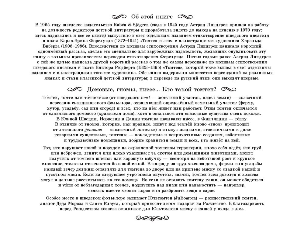 В 1965 году шведское издательство Rabеn & Sjögren выпустило в свет отдельным изданием стихотворение шведского писателя и поэта Карла-Эрика «Томтен и лис» с иллюстрациями художника Харальда Виберга. Впоследствии по мотивам стихотворения Астрид Линдгрен написала короткий одноименный рассказ, сделав это специально для зарубежных издательств, желавших опубликовать эту книгу с вольным прозаическим переводом стихотворения Форслунда. Пятью годами ранее Астрид Линдгрен с той же целью написала другой короткий рассказ о том же самом персонаже по мотивам стихотворения шведского писателя и поэта Виктора Рюдберга «Томтен», который тоже вышел в свет отдельным изданием с иллюстрациями того же художника. Обе книги выдержали множество переизданий на разных языках и стали классикой детской литературы; в переводе на русский язык они выходят впервые.