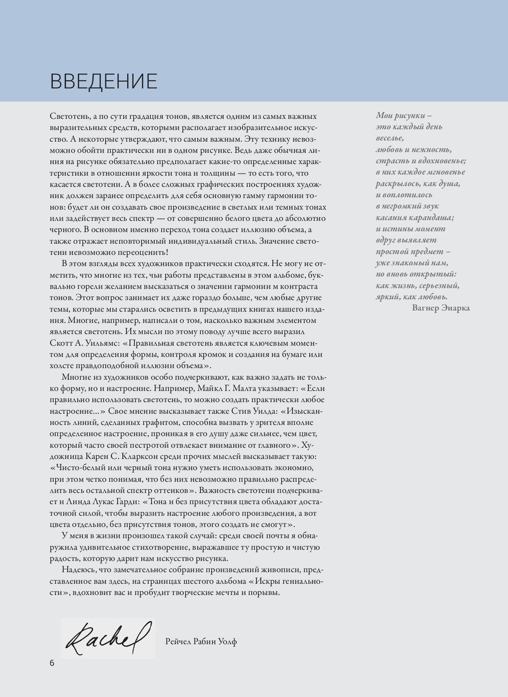 Этот альбом посвящён силе воздействия тона и светотени. Благодаря использованию всего разнообразия тонов (от самых тёмных пятен до самых светлых, между которыми расположен широчайший диапазон промежуточных оттенков) художник может выразить всё что угодно, создав произведение невероятной сложности – или, наоборот, сделав его предельно простым и прозрачным. Гармоничное сочетание тонов в большей степени, чем любой другой элемент изобразительного искусства, обладает способностью превращать плоскую поверхность листа бумаги в нечто объёмное и фактурное, а также передавать особое, неповторимое настроение. Книга подарит радость и вдохновение всем, кто интересуется изобразительным искусством, вне зависимости от уровня мастерства.