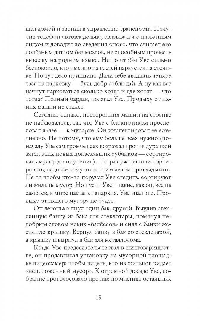 На первый взгляд Уве – самый неуживчивый человек на свете. Пожилой въедливый ворчун, достающий соседей вечными придирками. Его раздражают неправильно припаркованные машины, брошенный мимо урны мусор, говорящие на птичьем языке продавцы, портящие людям жизнь бюрократы...
