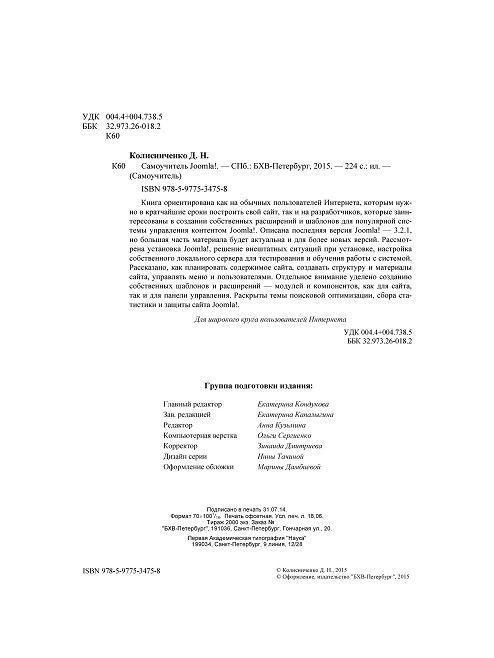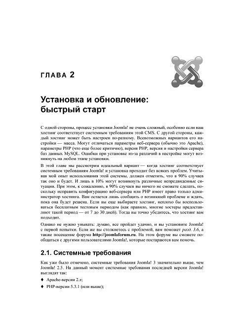 Книга ориентирована как на обычных пользователей Интернета, которым нужно в кратчайшие сроки построить свой сайт, так и на разработчиков, которые заинтересованы в создании собственных расширений и шаблонов для популярной системы управления контентом Jоomla!. Описана последняя версия Joomla! – 3.2.1, но большая часть материала будет актуальна и для более новых версий. Рассмотрена установка Joomla!, решение внештатных ситуаций при установке, настройка собственного локального сервера для тестирования и обучения работы с системой. Рассказано, как планировать содержимое сайта, создавать структуру и материалы сайта, управлять меню и пользователями. Отдельное внимание уделено созданию собственных шаблонов и расширений – модулей и компонентов, как для сайта, так и для панели управления. Раскрыты темы поисковой оптимизации, сбора статистики и защиты сайта Joomla!.