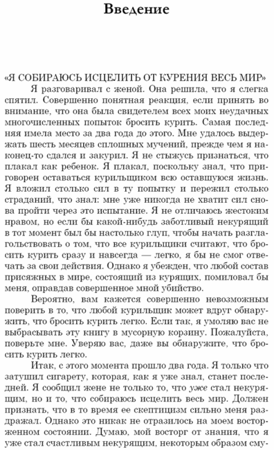 Курить люди перестают по одной из причин: 1) по собственному решению; 2) по причине смерти; Не могу сказать, что курил долго - 6 лет. Благодаря этой книге у меня получилось бросить курить. С тех пор прошло более 2 лет, но ничто не заставило меня вернуться к курению. Более того, избавление от табака был первый шаг, позже - отказ от алкоголя, здоровое питание, спорт, и как результат - совсем другая по энергетике, насыщенности и достижениям жизнь. Здесь нет никакого волшебства, - если вы ждете, что эта книга избавит вас от курения, напрасно. Многие прочитали ее и через неделю снова курили. Но хотя бы на неделю бросали все. А дальше каждый решает сам - вернуться к прежней жизни или прогрессировать. Если вы не хотите ничего менять в своей жизни, я думаю, книга вам не поможет. Если же хотите, но не знаете как, это ваш счастливый шанс. Жаль, что Карр умер, я бы хотел поблагодарить его лично.