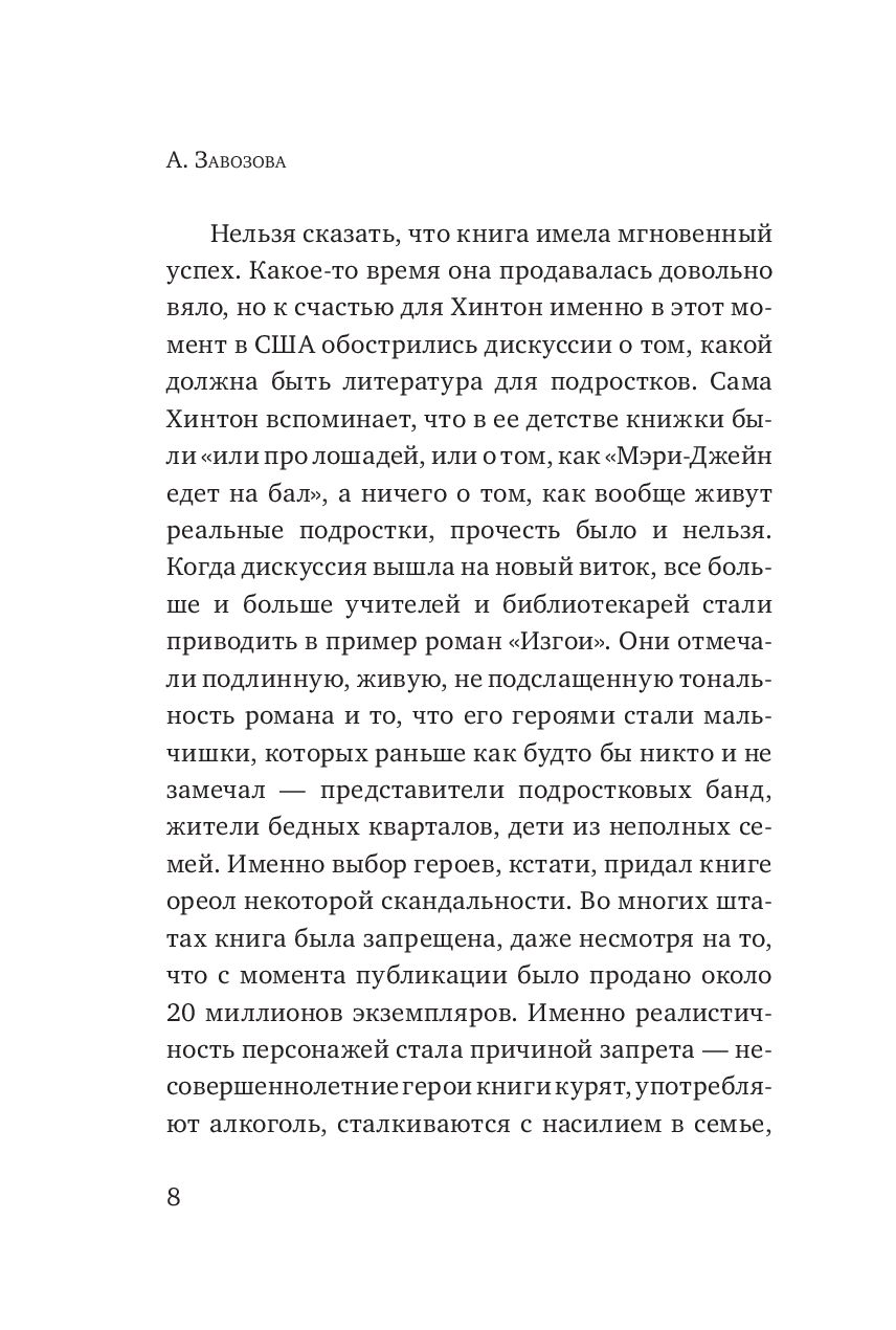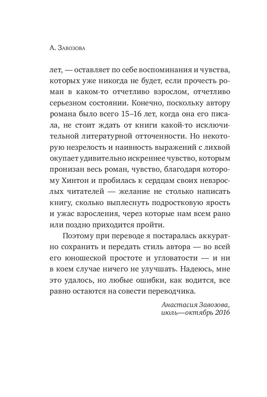 Написанная искренне и от души, книга повествует о проблемах реальных подростков – представителей подростковых банд, жителей бедных кварталов, детей из неполных семей. Американская ассоциация библиотекарей включила роман Хинтон в список "100 запрещенных книг XX века": в некоторых штатах он остается под запретом до сих пор, во многих других – давно включен в школьную программу.