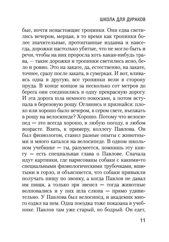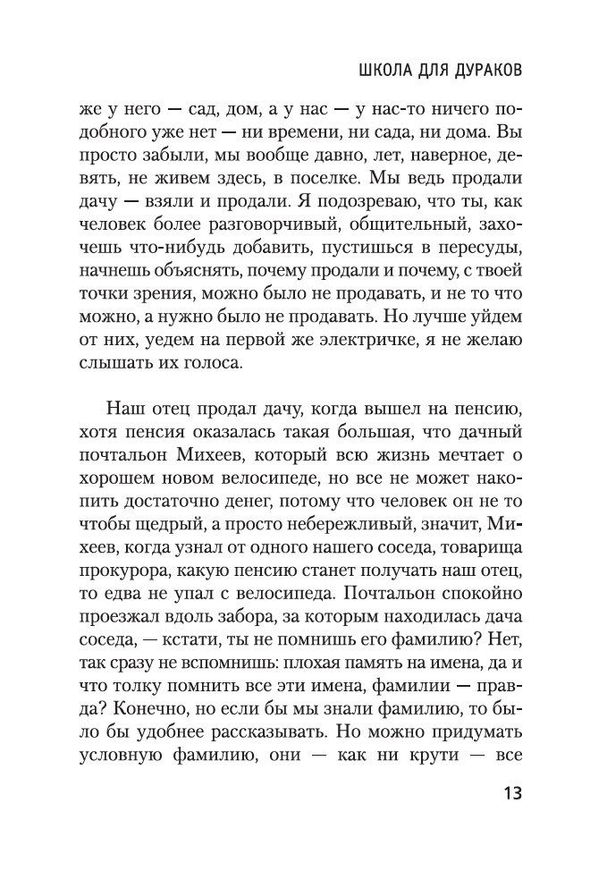 Роман "Школа для дураков" – одно из самых значительных явлений русской литературы конца ХХ века. По определению самого автора, это книга "об утонченном и странном мальчике, страдающем раздвоением личности... который не может примириться с окружающей действительностью" и который, приобщаясь к миру взрослых, открывает присутствие в мире любви и смерти.